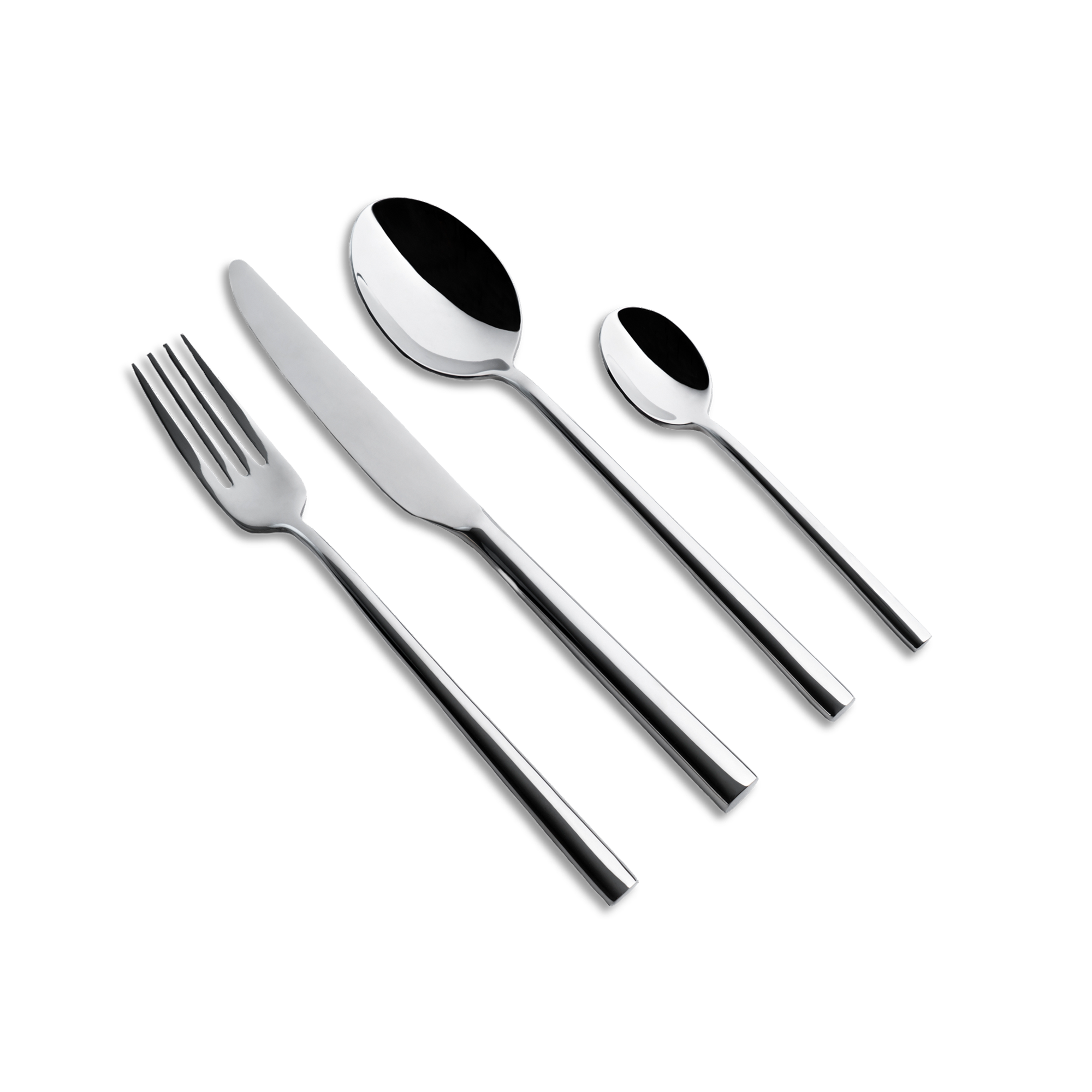 The 4-piece service includes dinner knife, fork, spoon, and teaspoon. Dishwasher safe; avoid alkaline detergents with alcohol or perfume, remove and dry at the end of the cycle, and don’t mix steel and silver in the same wash. PVD finishes are rated for cycles up to 60°C.