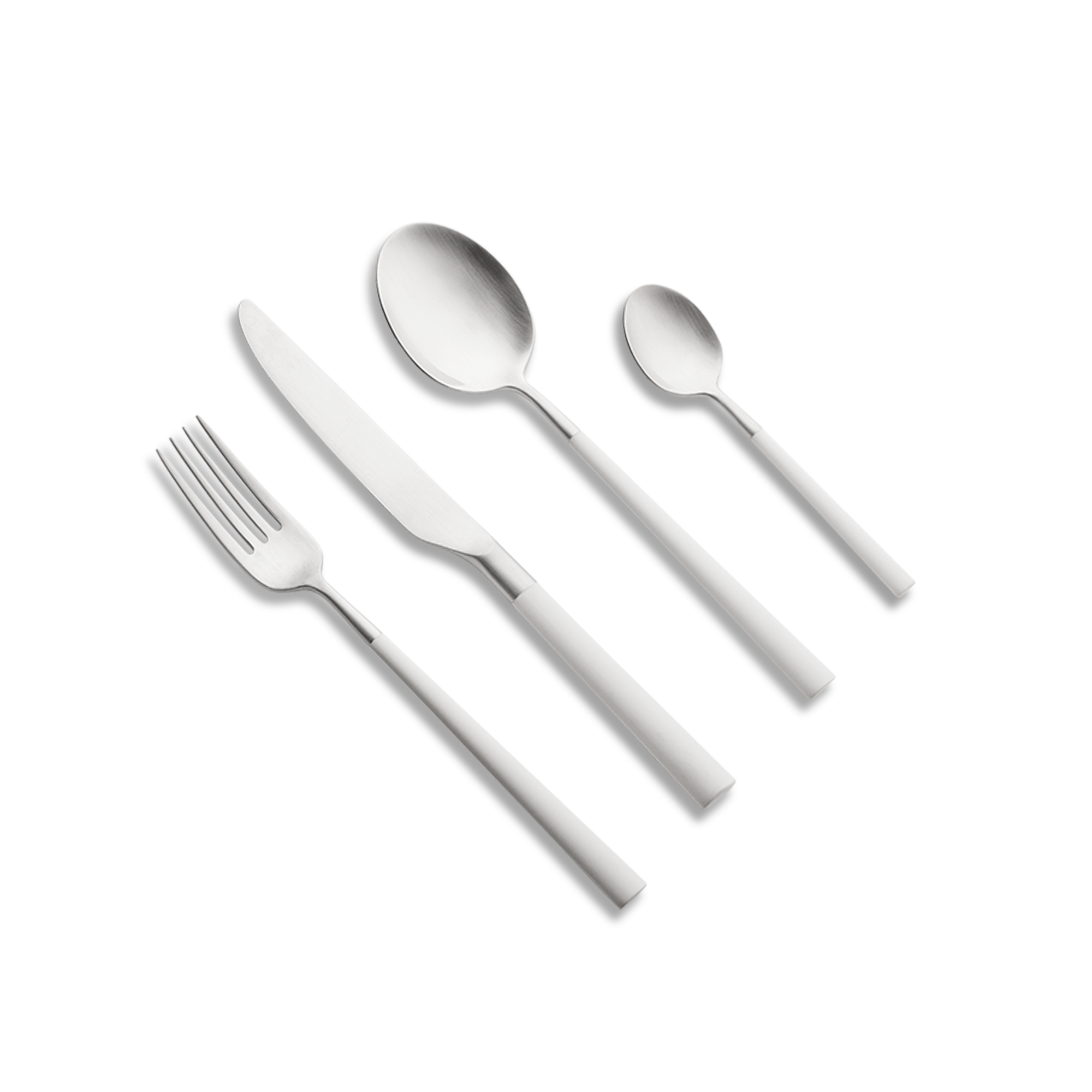 Each utensil pairs a softly brushed working end with a cylindrical handle in chalk-matte polymer—black or white. The co-moulding process bonds the material directly to the steel, so there are no collars, rivets, or edges to catch a finger. You feel a gentle weight at the heel; spoons don’t spin, the knife tracks straight, the fork tines have a clean taper that slides into leafy salads as easily as roast chicken. Light hits the satin steel like a graphite pencil line, while the handles stay quiet and dry in the hand.
