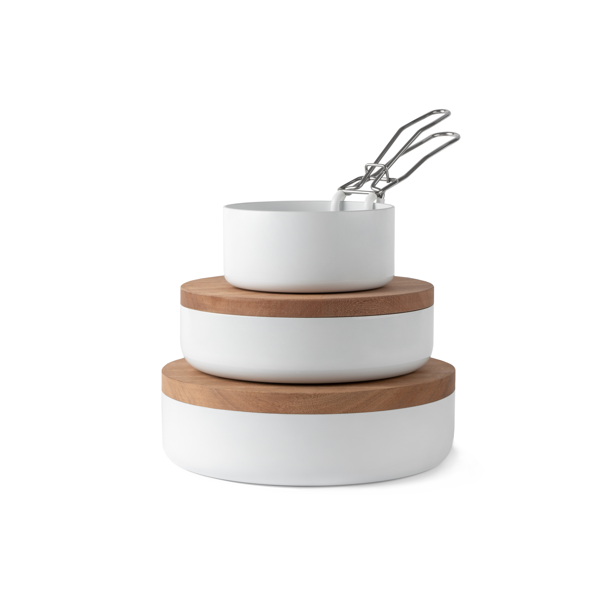 Part of knIndustrie’s ABCT concept—Antiaderente, Bianco Assoluto, Cucina, Tavola—the dish is designed for double duty. Clip on the removable handle for stovetop control; release it and the form becomes a clean serving bowl. Each casserole comes with mahogany-wood trivet/lid to carry a hot dish safely to the table, use it as a warm cover between courses, or park the bowl on it to protect surfaces.