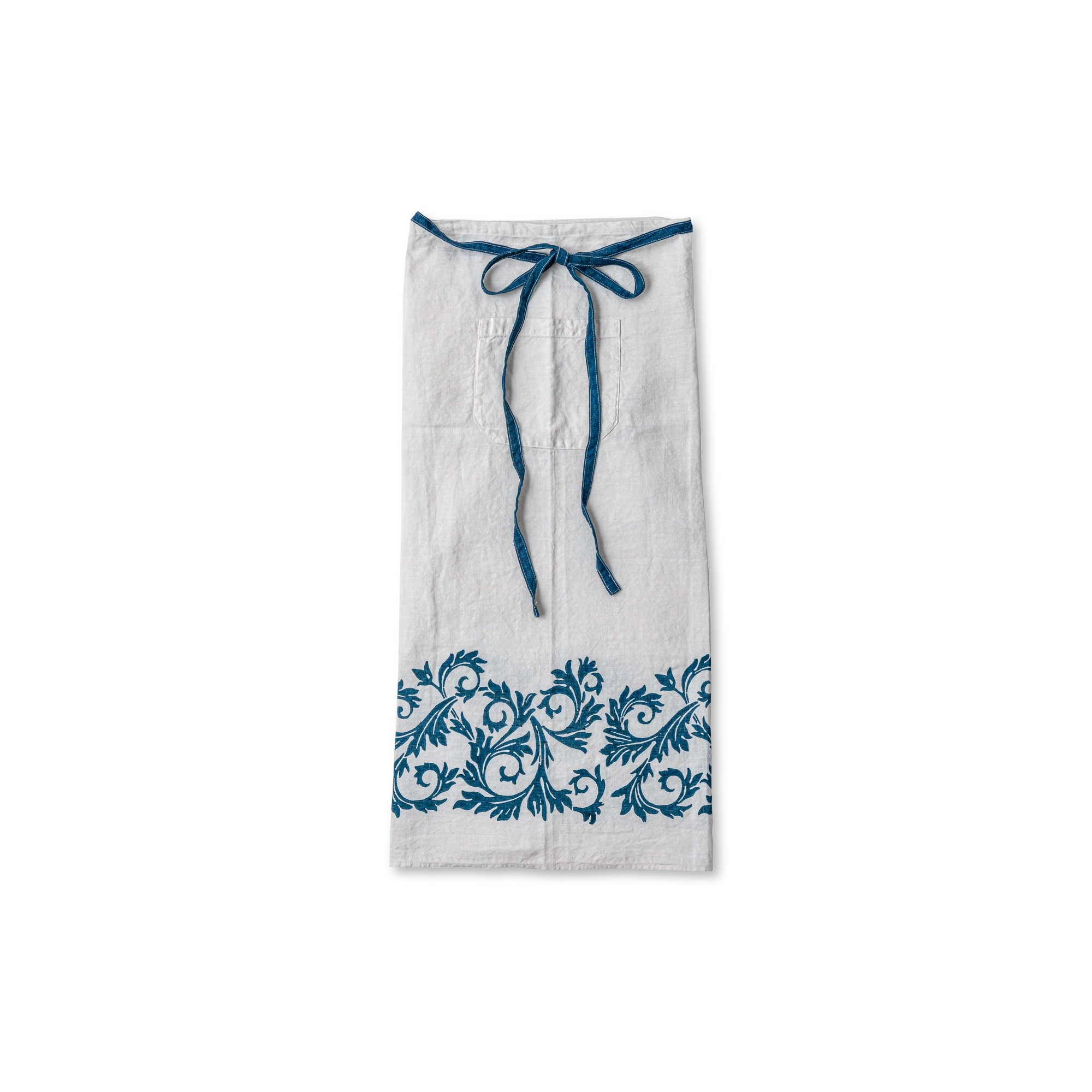 Cut from natural linen and printed by hand, the Acanto Cafe Apron brings a bit of theater to the everyday. The swirling indigo motif is applied using woodblock printing, a method Bertozzi has practiced in their Romagna workshop for over a century.