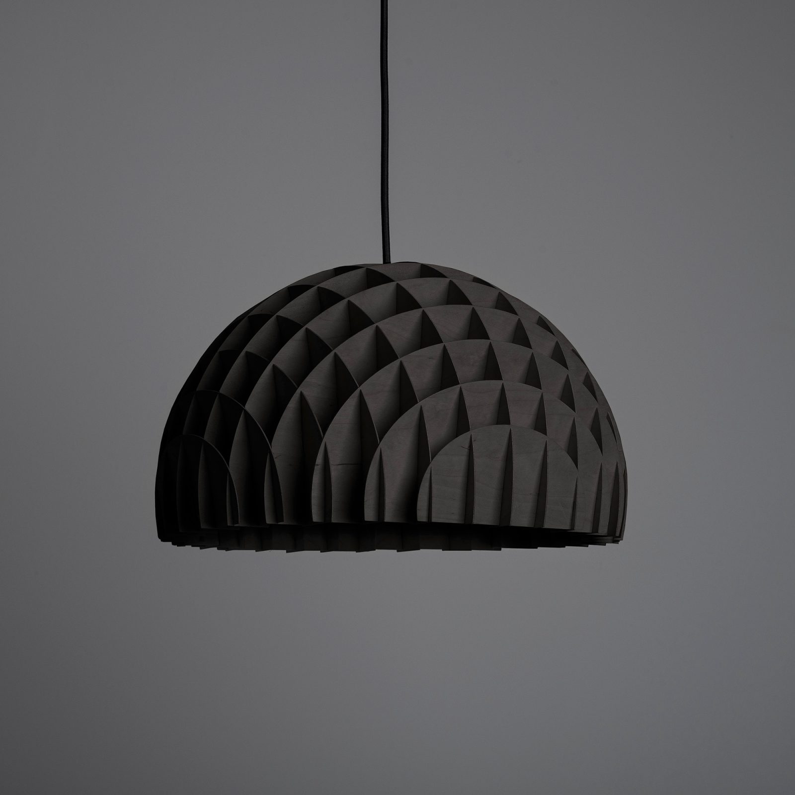 Transform a room instantly from bland to striking with this black geometric pendant light from Danish brand Lawa Design. Inspired by classic domes, this sculptural design combines the simple rounded shape of the architectural element with intricate geometric shapes. When in use, the light comes through the open areas of the dome, casting shadows on the ceiling and any nearby walls. However, thanks to its artistic design, this pendant light always takes center stage in a room. This version from the Arc series is made of plywood and features a black stained finish. Ideal for home offices, living rooms, entrance areas, or dining rooms.