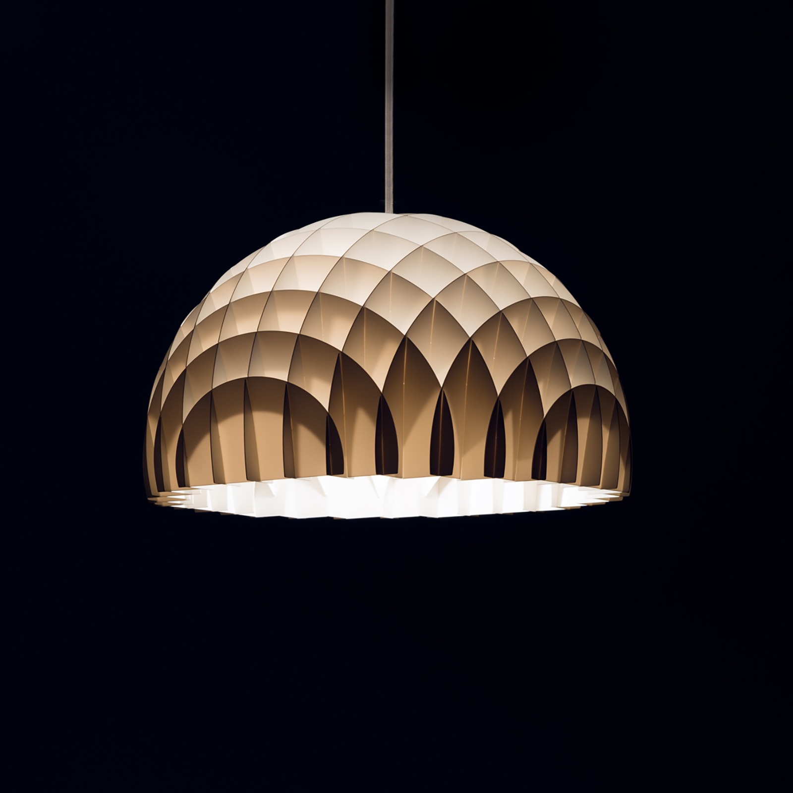 Put your love of creative design into the spotlight with this modern geometric pendant light from Lawa Design. Named Arc, the pendant light references both architectural domes and organic structures found in nature. The dome shape boasts bold geometric lines and patterns with cut-out sections that help to create a play of light and shadow on a room’s walls and ceiling. Made from white polystyrene, Arc comes with a matching fabric cable and an easy wire suspension installation system. Designed to illuminate with a soft light, this modern geometric pendant light is perfect to create a cozy mood in a room.