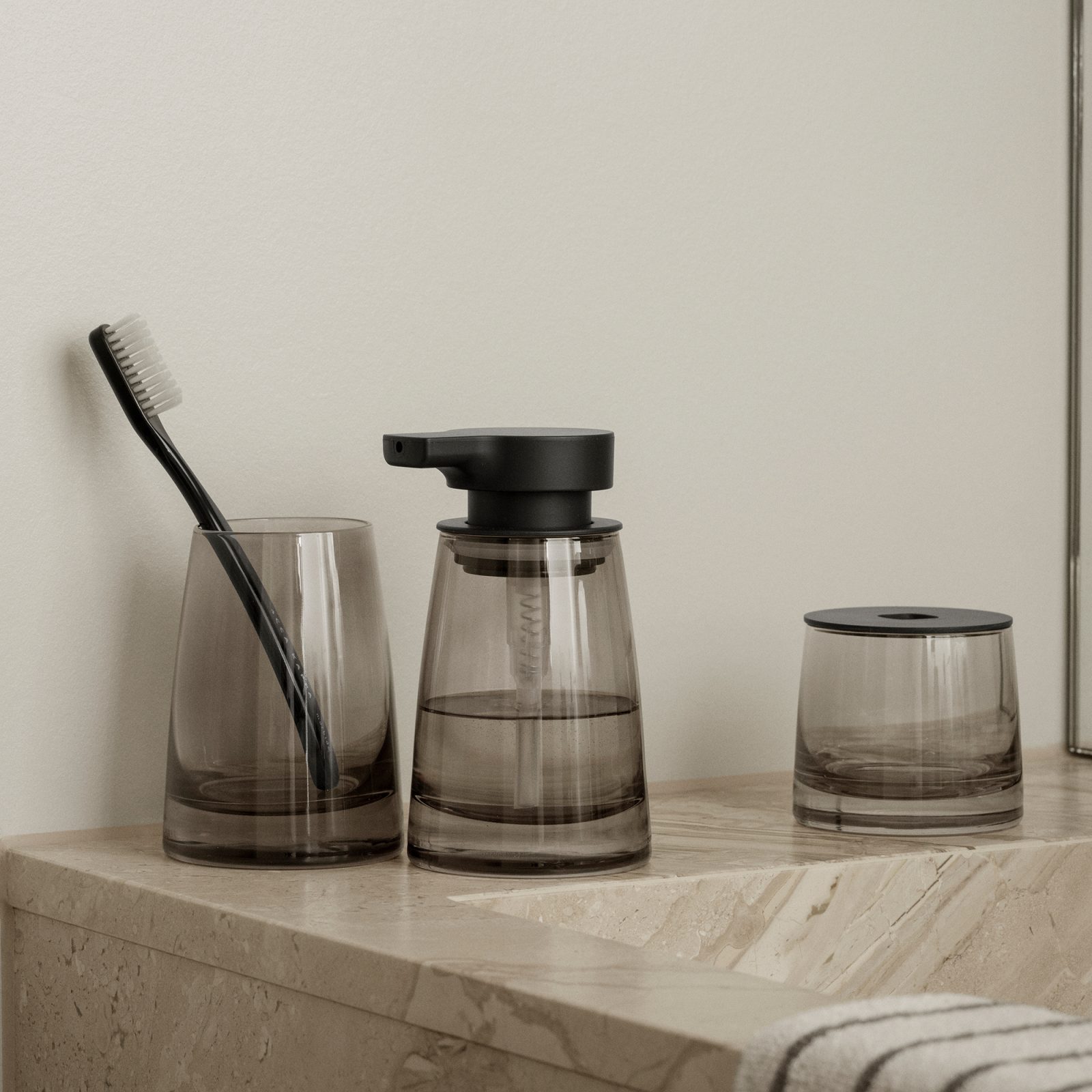 The hand-blown glass has a soft transparent color that deepens toward the base, where the material becomes thicker and more luminous. The lid sits neatly on top, with a small opening detail that makes it easy to lift. In the tan version, the piece has a warm amber tone that works beautifully with stone, wood, white tile, or a simple bathroom shelf.