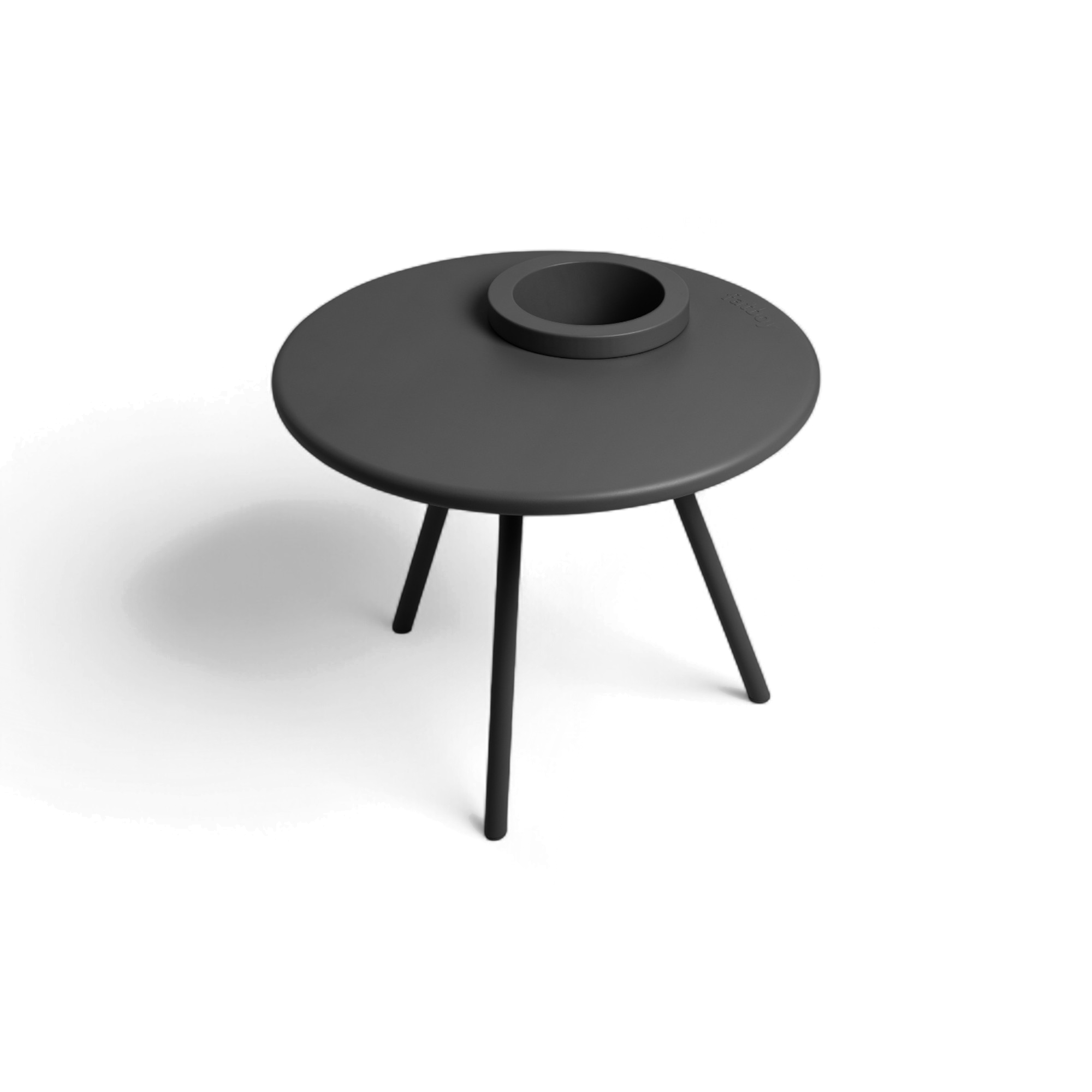 Three slim steel legs, a round tabletop, and one tidy opening just big enough for a pot—that’s Bakkes. The planter drops in flush, so leaves hang naturally over the edge while the rest of the surface stays clear for books, a glass, the TV remote, whatever ends up there by day’s end.