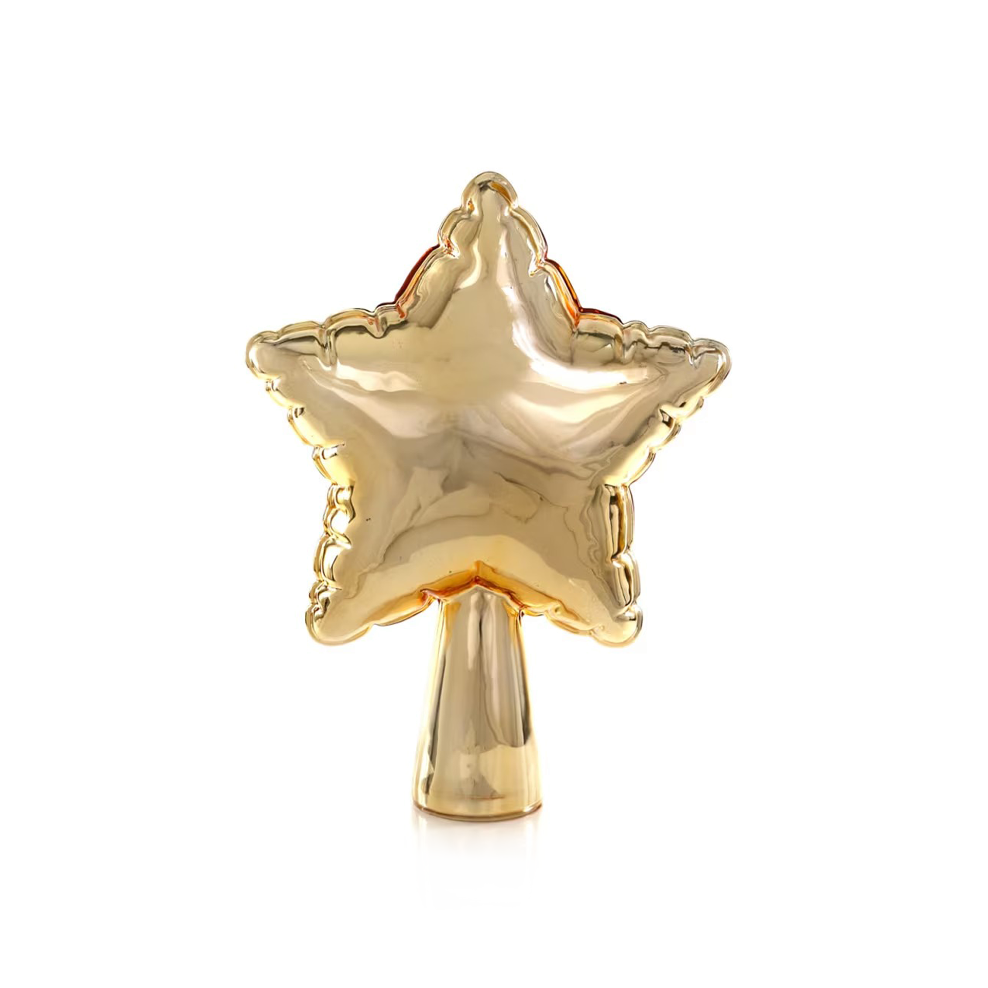 From a distance it looks like a foil balloon, but this balloon star tree topper is hand-formed from glass. The star shape is slightly puffed, with soft creases along the edges that give it the playful look of something inflated.