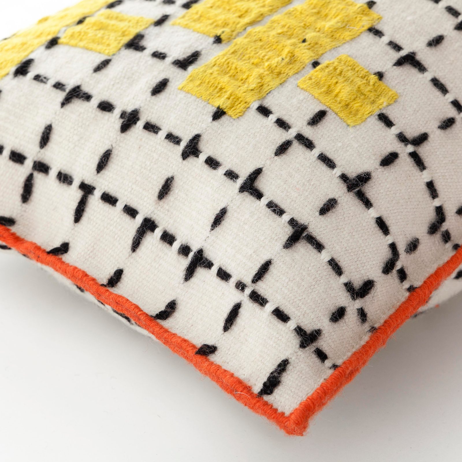 A modern take on textile artistry, the Bandas Pillow C by Patricia Urquiola features a geometric grid pattern punctuated by raised yellow wool embroidery. Handwoven using traditional techniques, this design plays with texture and depth, creating a visually striking accent piece. Finished with a contrast trim, it works seamlessly with the Bandas collection or as a statement cushion on its own.