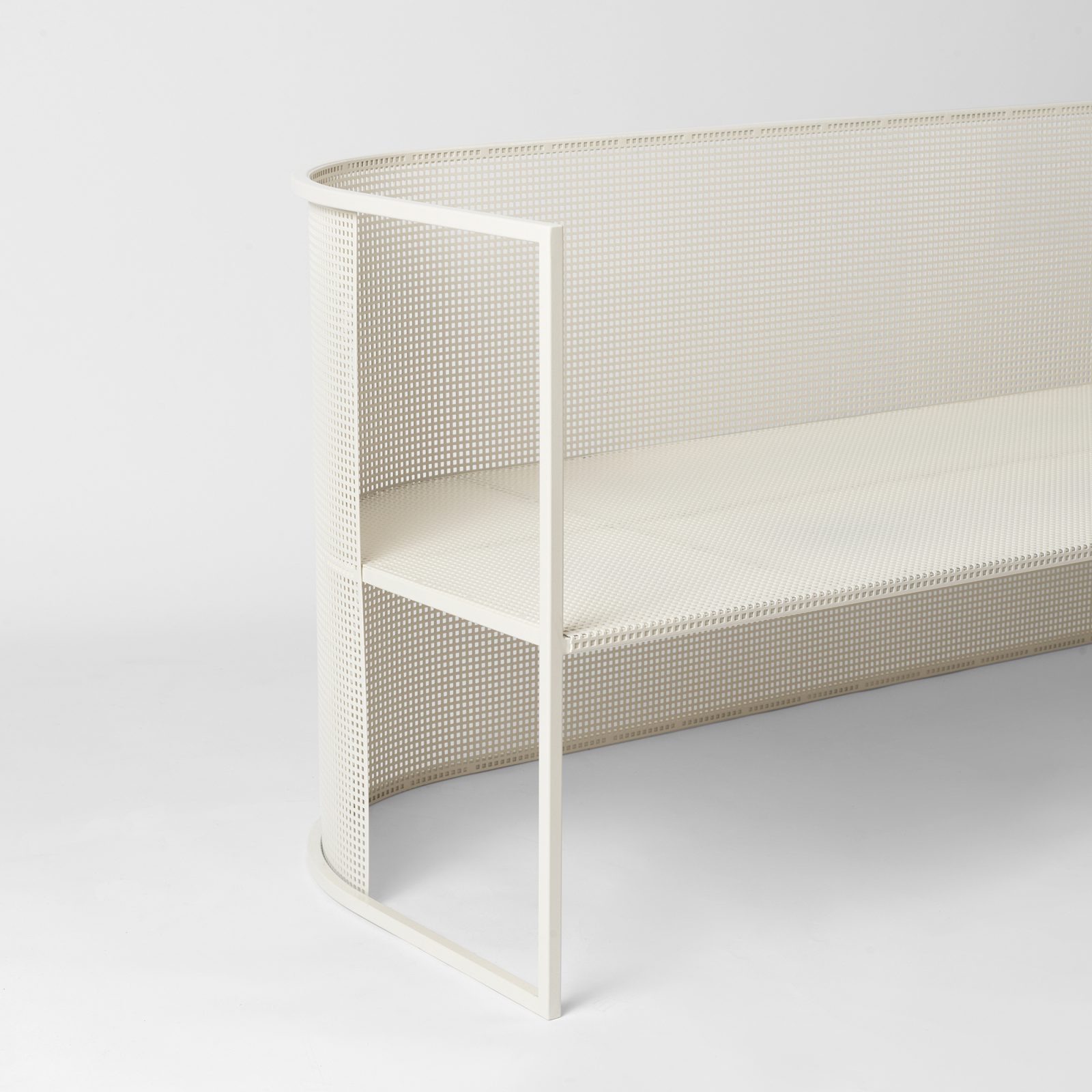 Whether indoors or outdoors, the Kristina Dam Studio Bauhaus Lounge Bench refines any space with its distinctive silhouette. Part of a larger series of outdoor furniture, this bench offers an elegant solution to create a spectacular lounge area, especially when paired with the lounge chairs from the same collection. Beautifully curved and minimalist in its geometric expression, the Bauhaus bench boasts an arched backrest that sweeps around the users and creates two armrests. A signature feature of the series, the grid with small perforations covers the entire back section, leaving two voids in the front that highlight the clean lines of the frame. Manufactured with outdoor areas in mind, the Bauhaus lounge bench is made from stainless steel with a powder-coated finish. Great for terraces, patios, and gardens, this bench also suits restaurants or cafés.