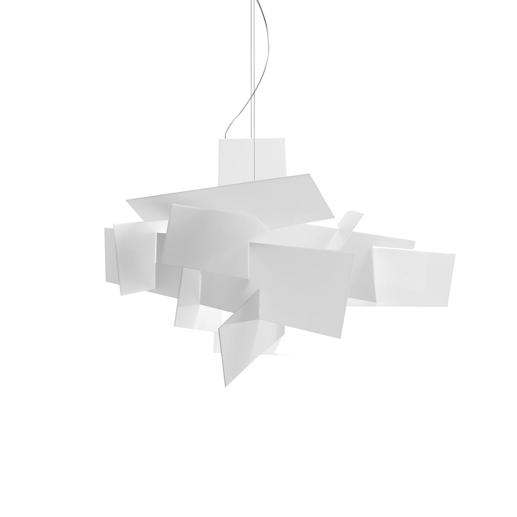 An explosion frozen in mid-air. Designed in 2005 by Enrico Franzolini & Vicente Garcia Jiménez, the Big Bang pendant layers six irregular sheets of translucent methacrylate around a slim aluminum core. The planes overlap like shattered glass, scattering glare-free light in every direction while casting sharp, graphic shadows on walls and ceiling.