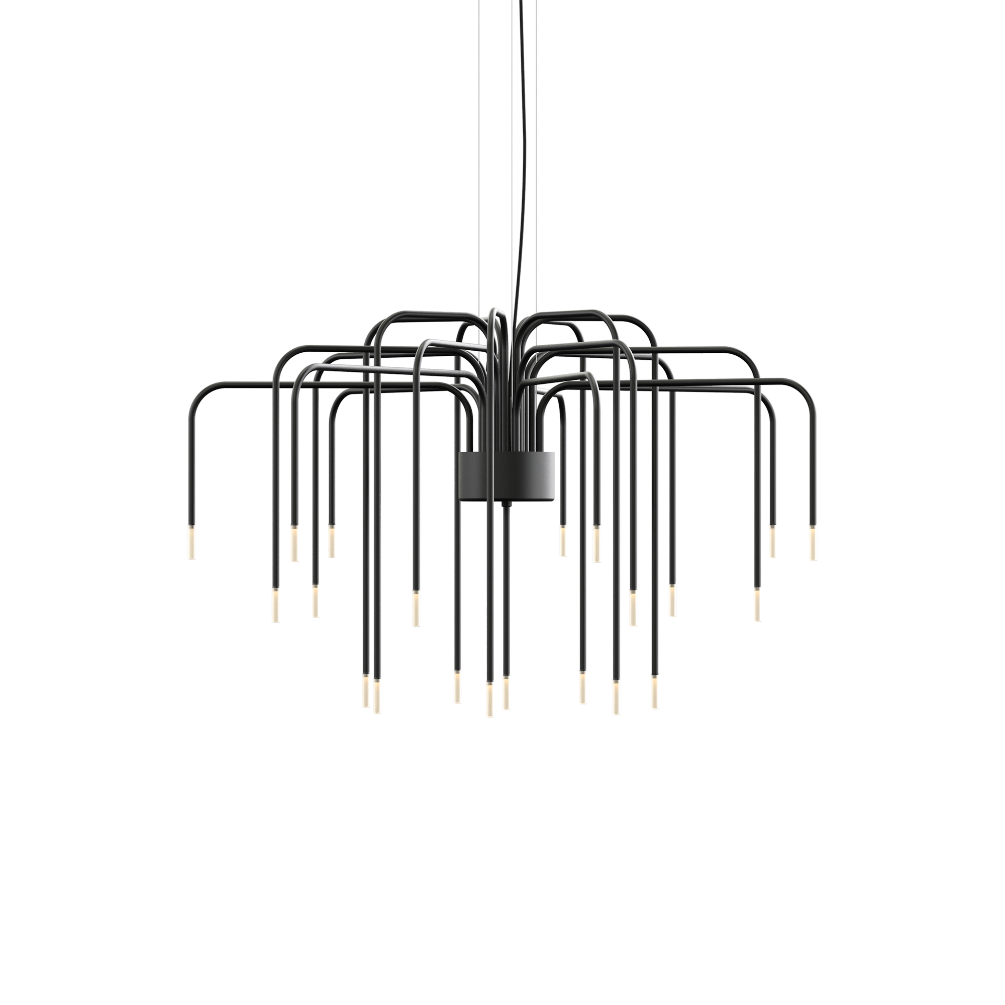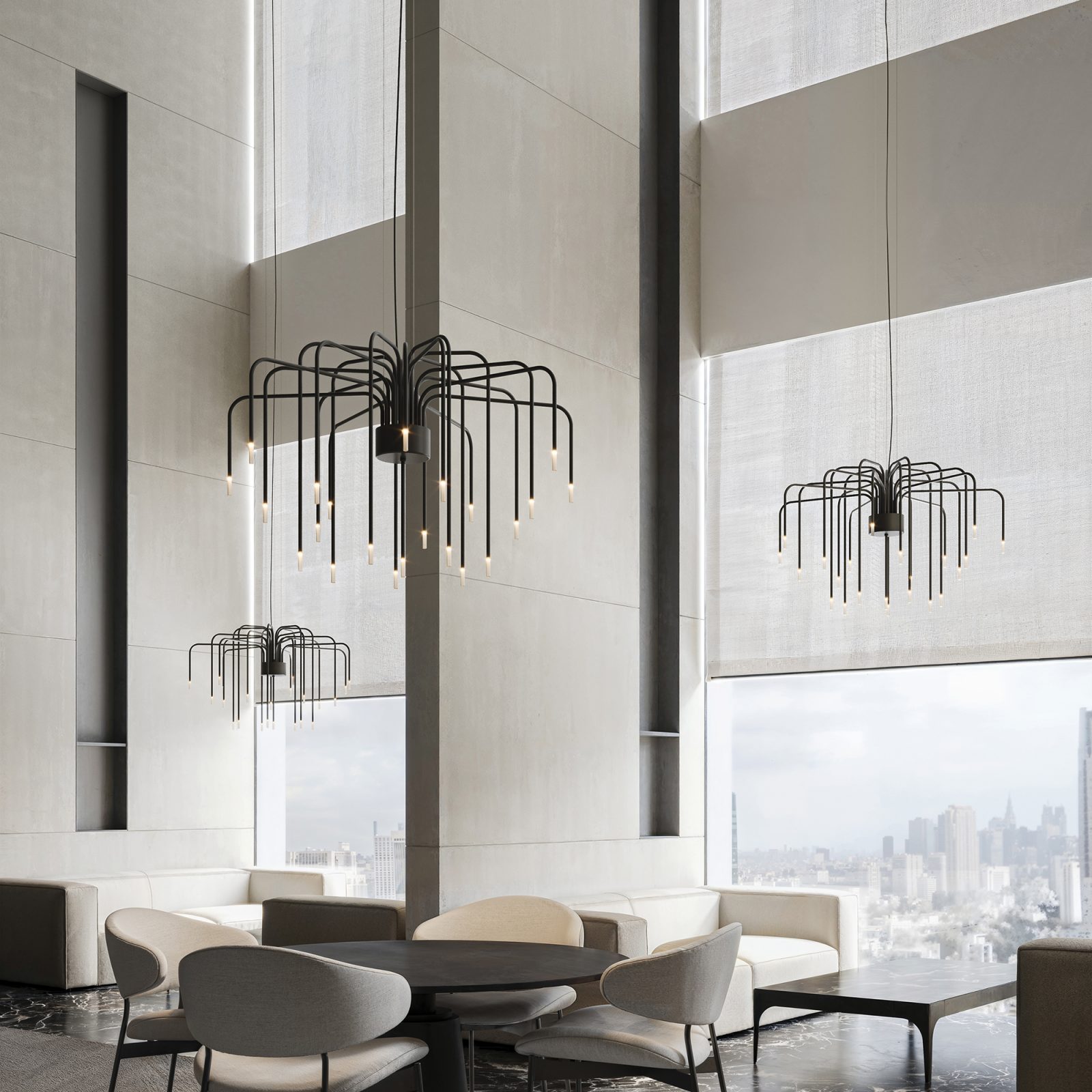 Boom treats light like an event. Twenty-two slender aluminum arms burst from a compact core, bend into measured arcs, then taper to frosted cylinders that glow like slow-falling embers. Matteo Ugolini’s composition does away with the pomp of a traditional chandelier, swapping crystal for negative space and letting rhythm do the ornamentation. The matte black finish recedes by day; at night the tips float, sketching a silent firework over dining tables, double-height lobbies, or arcaded terraces. Integrated LEDs keep the profile lean and unobtrusive, while fine suspension cables make the whole piece read almost weightless—just a poised moment caught mid-trajectory. Crafted in Italy by Karman, Boom pairs theatrical scale with an understated palette, delivering drama that feels at home in both pared-back interiors and richly layered settings.