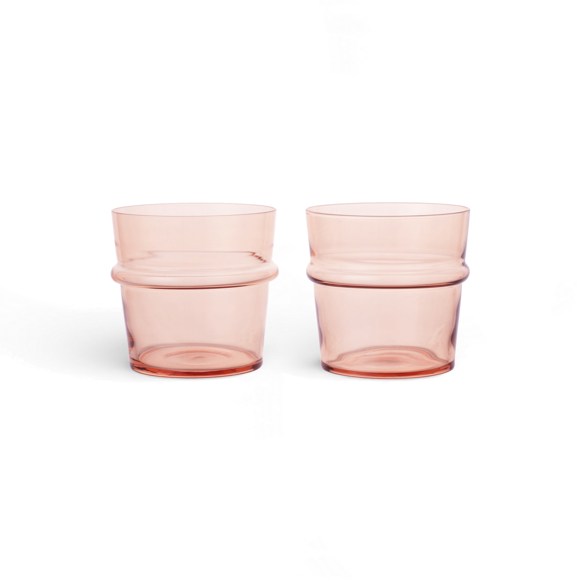 Set of 2 recycled glass tumblers with a rounded grip band. Mouth-blown, dishwasher-safe, and available in Blush, Mauve, Yellow, Clear with Bubbles, and Smoked Grey.