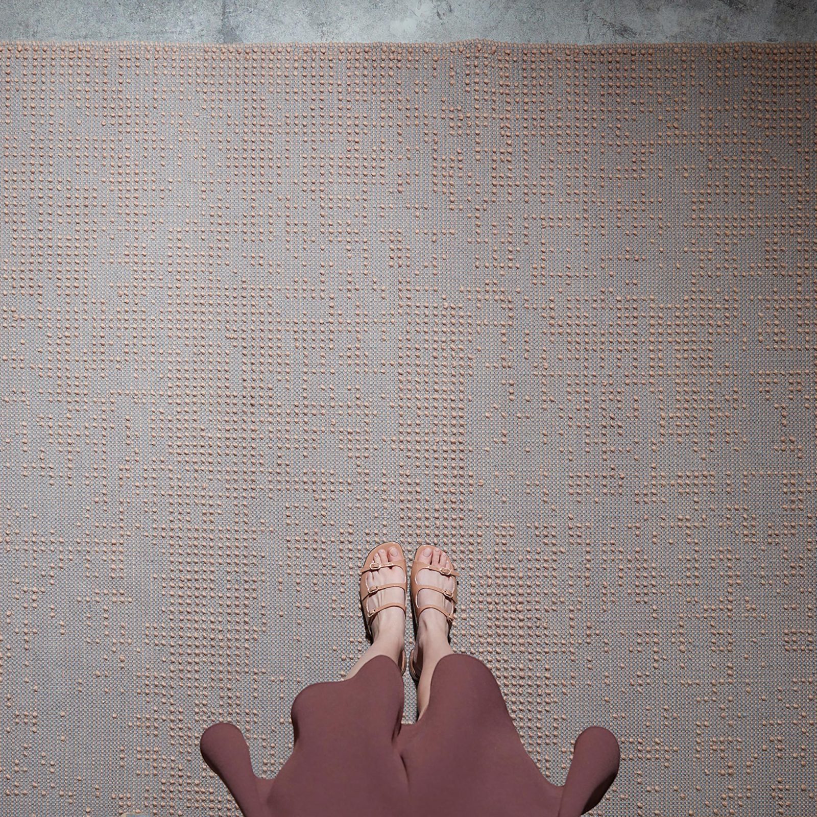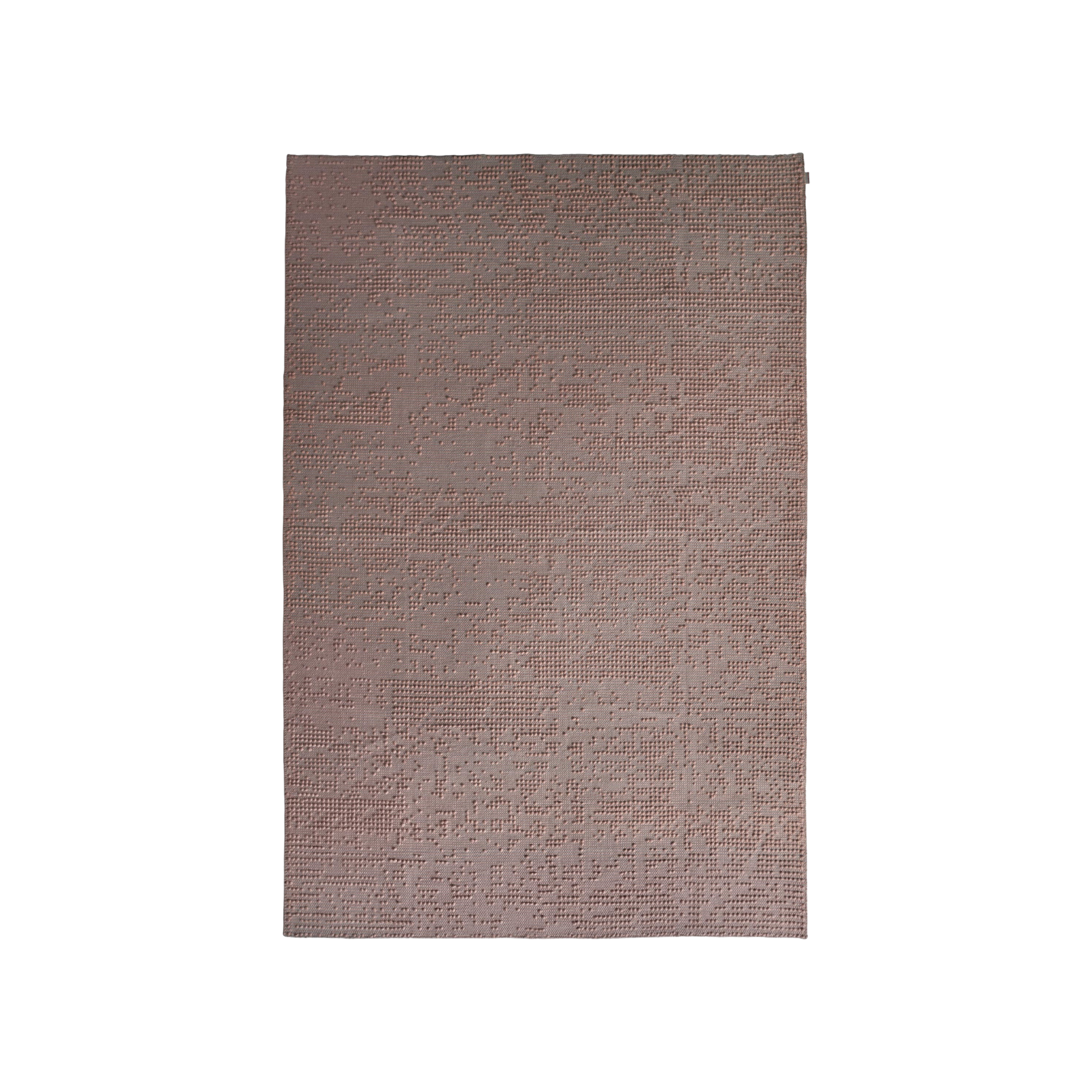 Braille is a wool rug with raised Tencel dots worked across the surface in an irregular grid. The dots create a noticeable tactile pattern — you feel it under your hand and see the texture clearly when the light hits from the side. The base weave is tight and even, so the raised elements stand out without making the rug difficult to walk on or place furniture over.