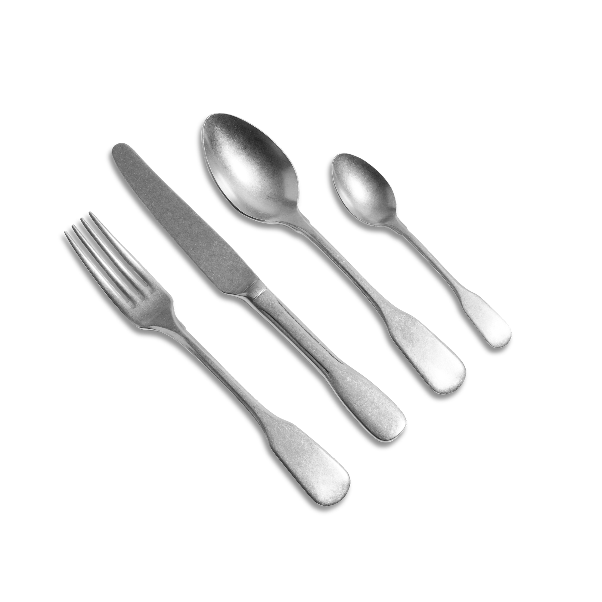Brick Lane takes its name from London’s old street market and borrows the easy grace of classic flatware you’d see in long-running cafés there. The profiles are familiar—slender necks, rounded spoon bowls, a gently tapered dinner knife—given a quiet edge by the softly grained, stone-washed surface. Each piece sits well in the hand, with enough weight to feel sturdy and a handle shape that rests flat on the table.