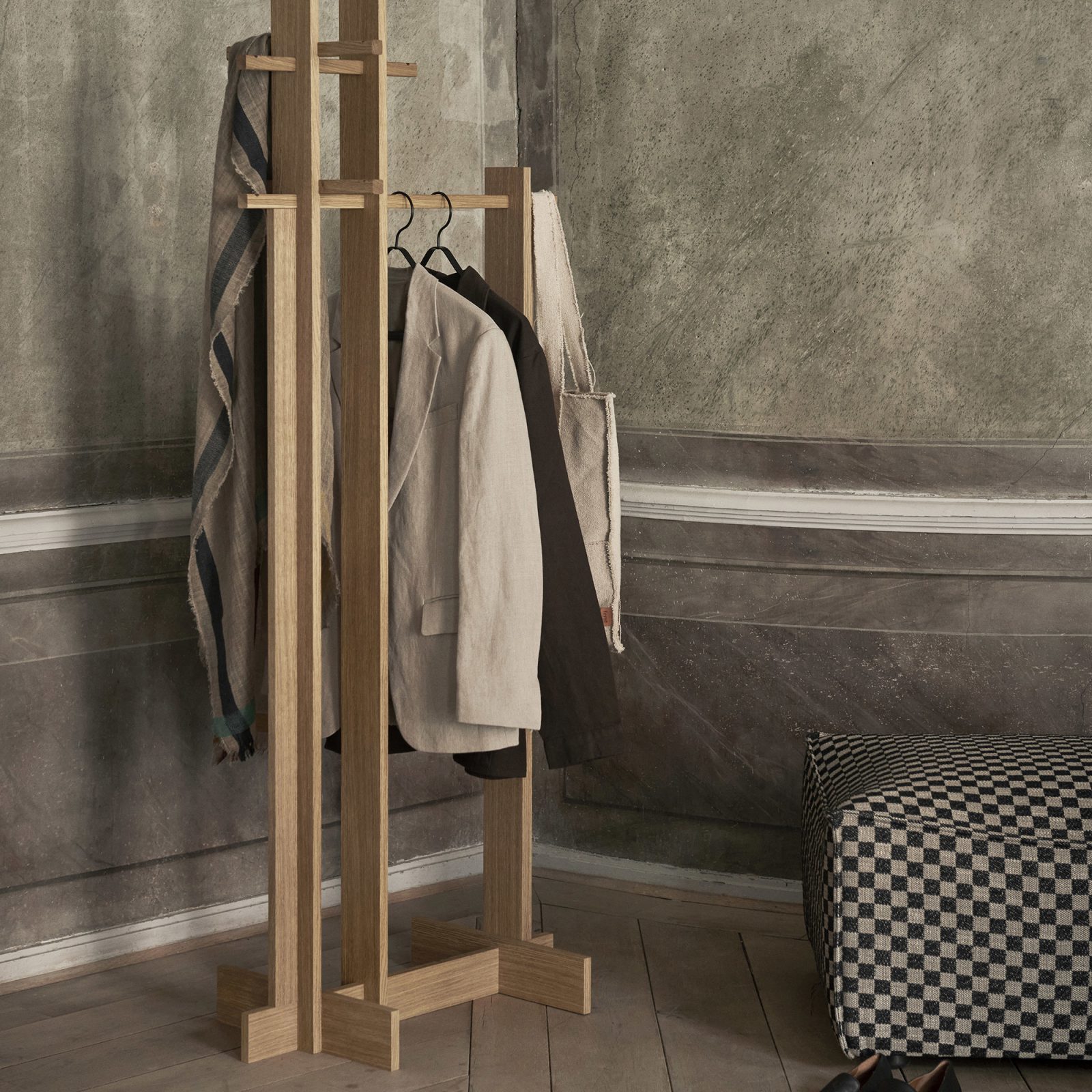 Perfect for bedrooms and hallways in equal measure, the Ferm Living Bridge Clothes Stand offers an elegant solution to organize clothing and accessories while keeping them easily accessible. Taking its aesthetic cues from architectural designs, the stand features intersecting elements that not only create an eye-catching pattern with a dynamic rhythm, but also enhance function. For example, you can use the rails for hangers and also place bags, scarves, hats, and even jewelry on hooks. Made to look beautiful anywhere, the Ferm Living Bridge Clothes Stand is also durable. It’s manufactured with solid oak racks and panels that combine an oak veneer with an MDF core.