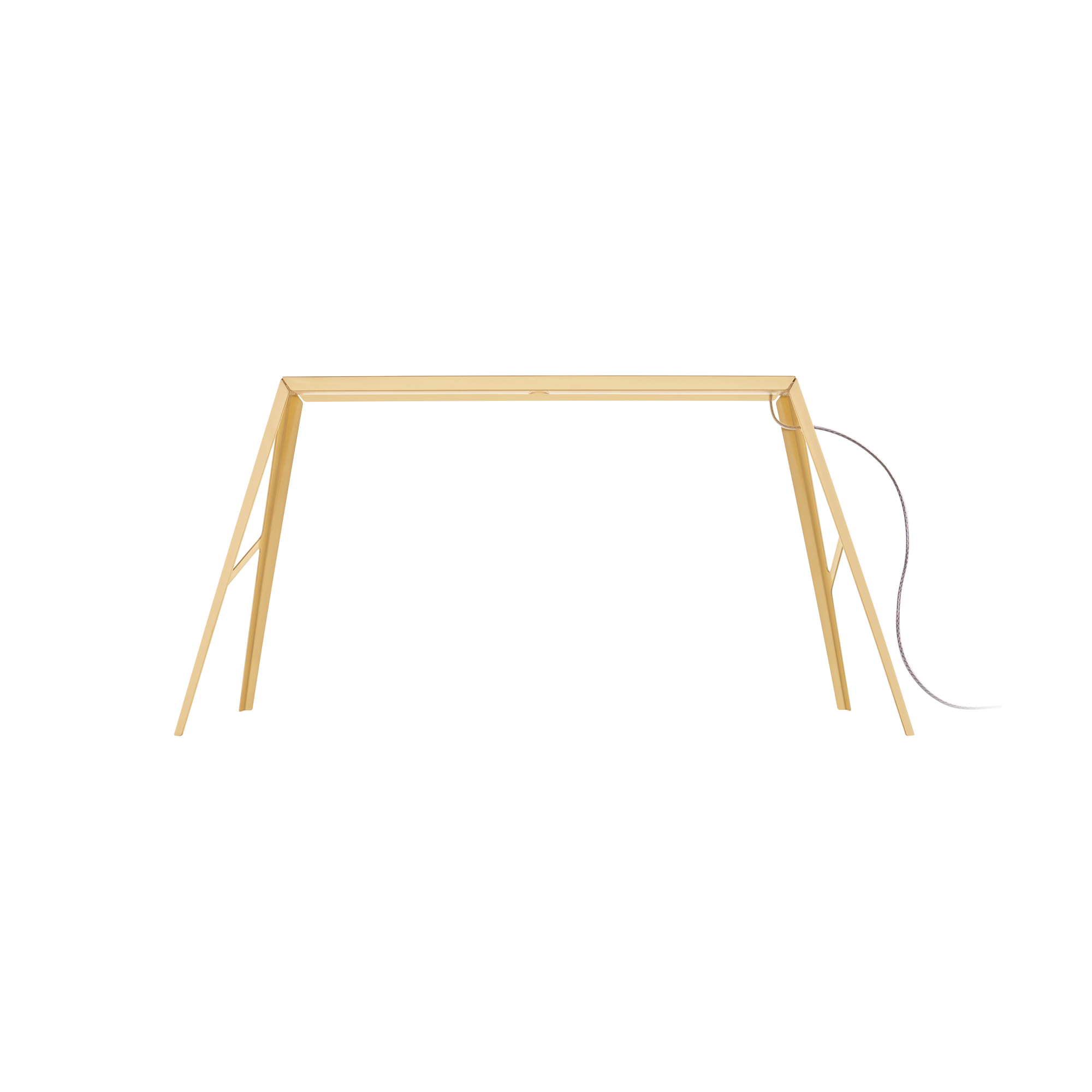 Bridge begins as a single sheet of steel. Lasers trace the outline, a press folds the shape, and suddenly the flat plane stands on four slender feet—a quiet arch that lifts light off the desk. No welds, no screws, just geometry doing the work.