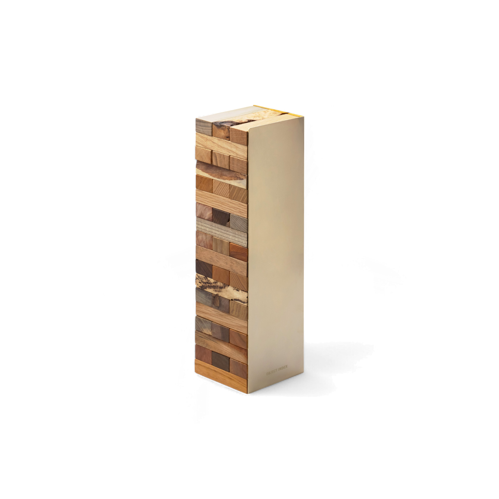 Slide one block free and you’ll see the surprise: every piece comes from a different tree, a quiet archive of grain, color, and weight. Studio Fujino’s Building 101 looks like a refined take on the stacking game—until you notice the bark still clinging to one edge, the ripple of burl on another, the pale streak where cherry sap once flowed. The 2025 edition pairs reclaimed hardwoods with a handful of Somei-Yoshino cherry blocks carved from retired trees in Tokyo’s Sumida Park, turning each move into a small encounter with a living history. The set arrives numbered, nested in a brass stand that lets you build a tower or display the pieces like specimens. Over time the surfaces pick up subtle nicks and a soft polish from play, making the sculpture more personal with every tumble and rebuild. Part game, part material study, Building 101 invites curiosity without saying a word—its stories stay tucked inside the wood, waiting for touch to bring them out.