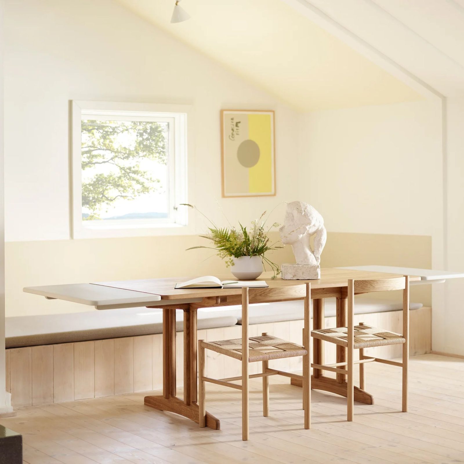 Børge Mogensen drew this shaker style dining room table in 1950 for FDB Møbler, but it never made it to production. The reason? Its cross-leg structure was too ambitious for the tools of the time. Decades later, the design finally sees the light—clean, restrained, and quietly confident. The solid oak top has soft, rounded corners. The frame tucks in neatly, leaving space for legs and movement. It’s practical. It’s understated. And like much of Mogensen’s work, it feels like it’s always been there.