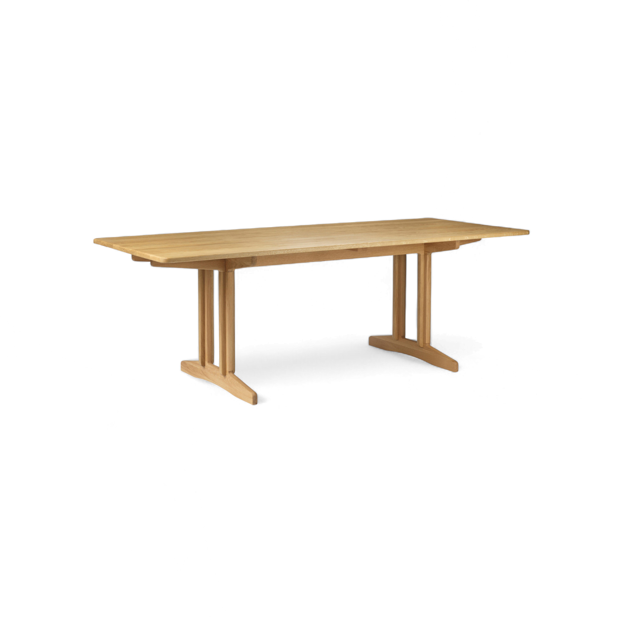 Børge Mogensen drew this shaker style dining room table in 1950 for FDB Møbler, but it never made it to production. The reason? Its cross-leg structure was too ambitious for the tools of the time. Decades later, the design finally sees the light—clean, restrained, and quietly confident. The solid oak top has soft, rounded corners. The frame tucks in neatly, leaving space for legs and movement. It’s practical. It’s understated. And like much of Mogensen’s work, it feels like it’s always been there.