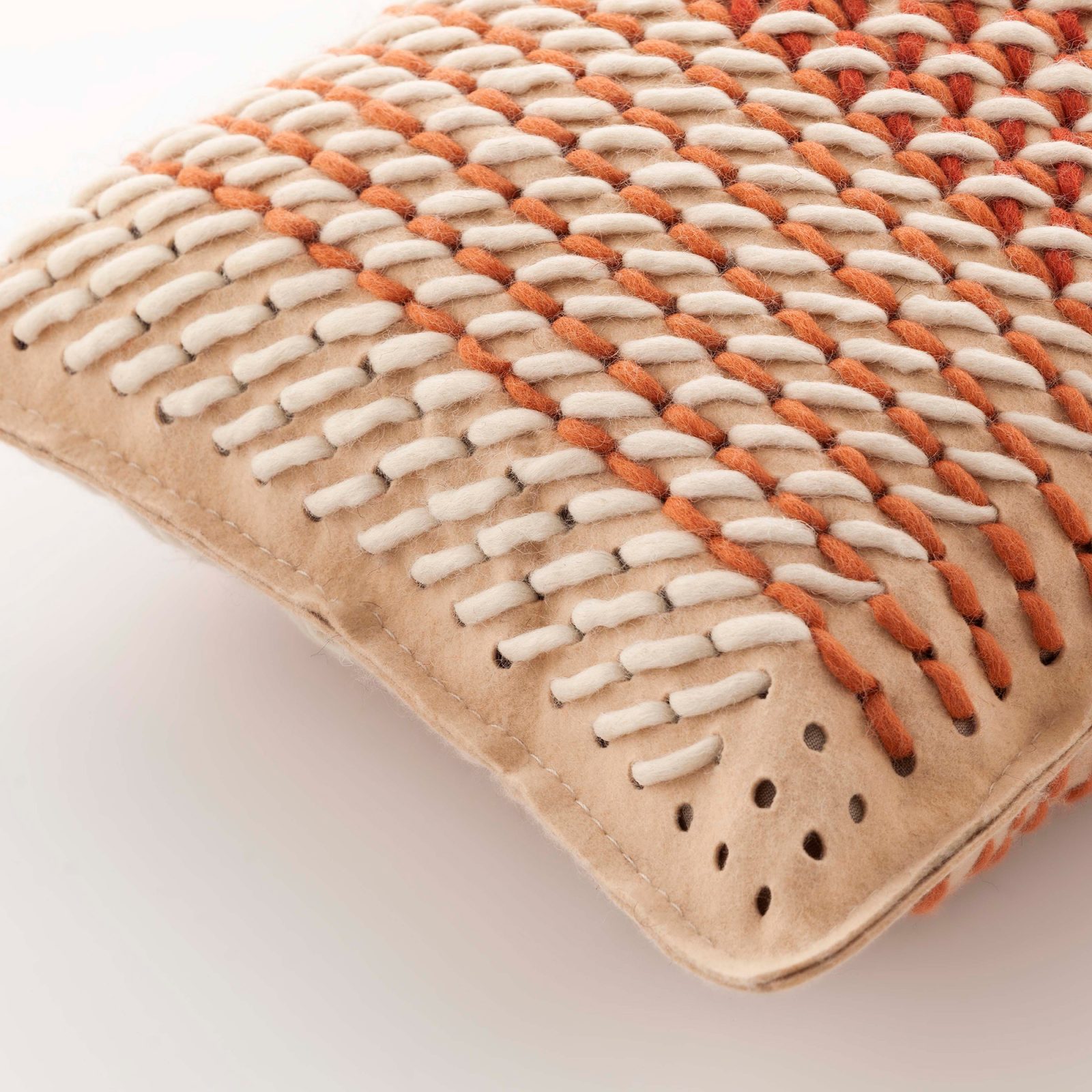 The Canevas Geo Pillow by GAN Rugs, designed by Charlotte Lancelot, reinvents traditional cross-stitch embroidery with a modern, layered aesthetic. Hand-stitched on a perforated felt base, the design features thick virgin wool threads in intersecting hues, creating depth and texture through varying stitch directions and color densities. This square Coral version combines orange, dark coral, and white wool on a light gray felt base, producing a dynamic, tactile surface. Part of a larger series that includes rugs and complementary pillows, Canevas Geo is crafted by Indian artisans using time-honored techniques. The modular approach of the GAN Spaces collection allows these pieces to function individually or as part of a coordinated interior design concept.
