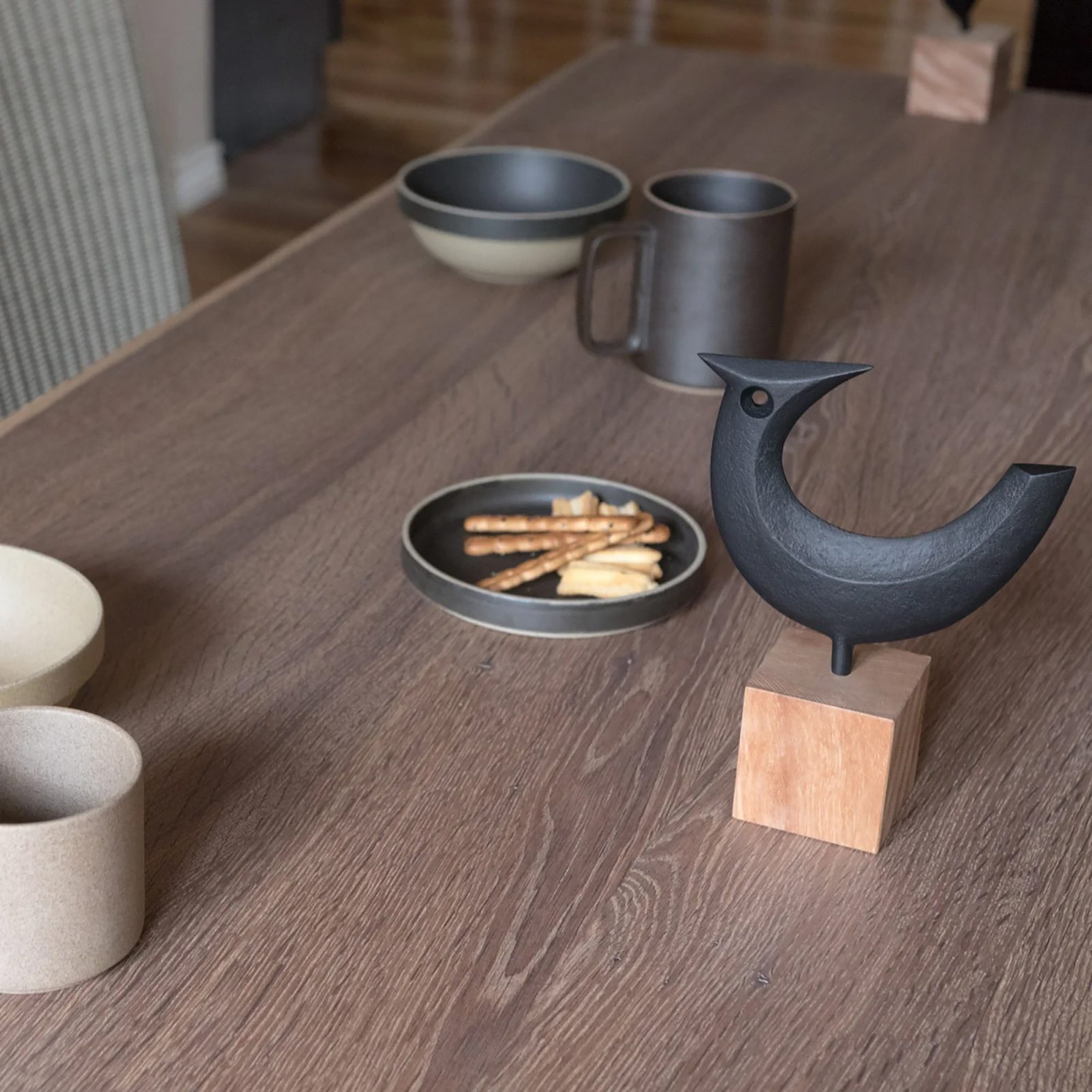 Inspired by the green pheasant, the national bird of Japan, the Kamasada Cast Iron Bird symbolizes harmony, creativity, and power. In the hands of Nobuho Miya, ironware master and head of family-run Kamasada, this particular bird gains a distinct gracefulness and beauty. Featuring a curved shape and an abstract form that preserves the character of the pheasant, this decorative object adds an eye-catching accent to any shelf, table or desk. A cubic base provides the perfect pedestal for the bird, anchoring the piece and complementing the cast iron material with the warmth and textures of solid wood. Ideal as a gift, the Kamasada Cast Iron Bird sculpture is part of a series that also includes other birds and fishes.