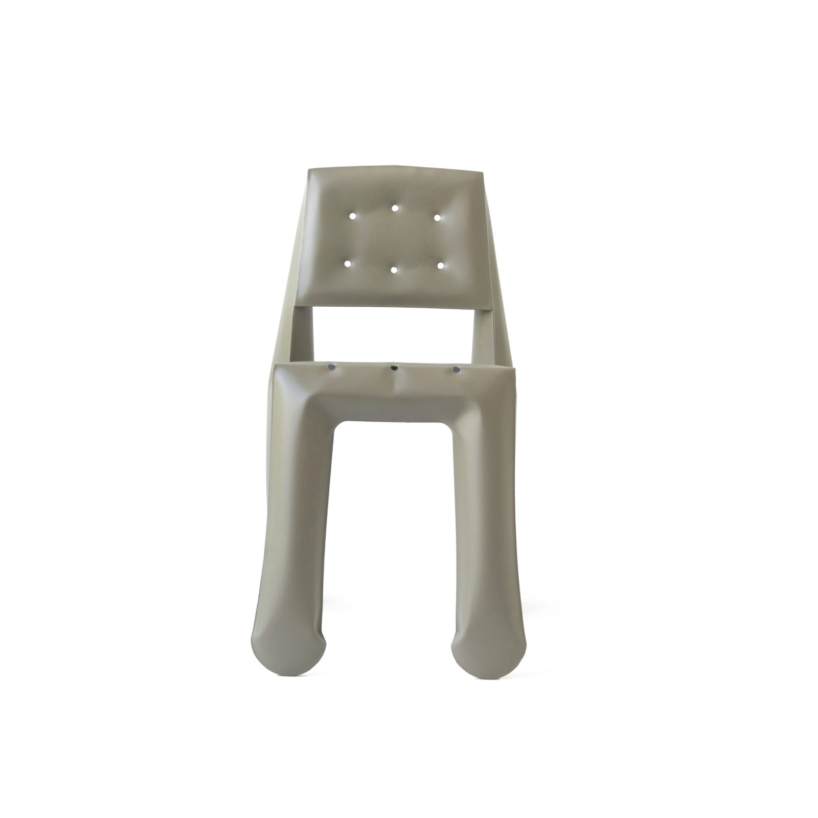 Designed by Oskar Zięta, the aluminum Chippensteel rethinks an 18th-century silhouette using FiDU, a process that welds and air-forms thin metal into volume. Up close, the evenly spaced perforations read like tufting; the curves are crisp, not padded—your eye swears fabric, your hand knows metal.
