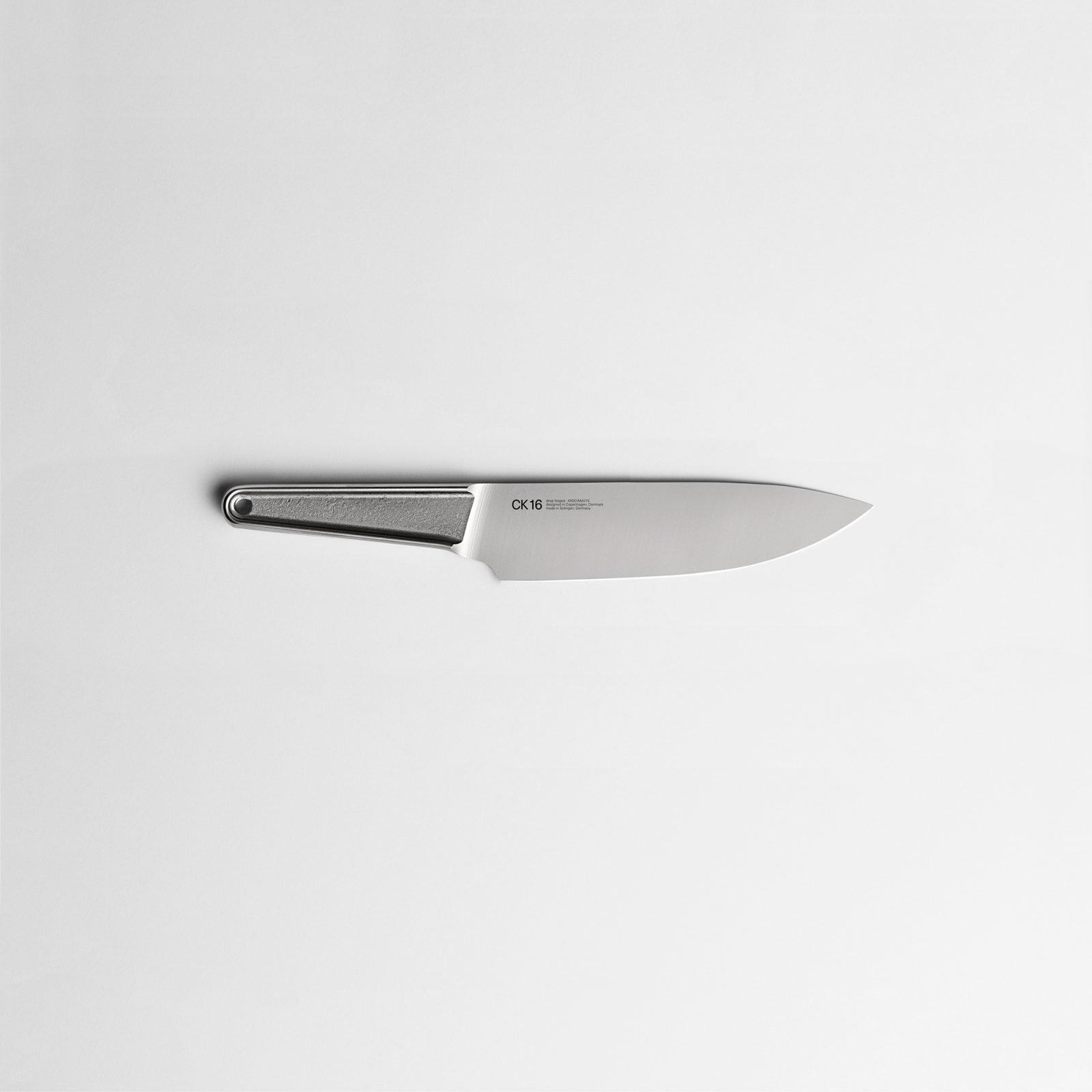 Following on the success of the popular Veark CK20 chef’s knife, the CK16 model provides the same functionality, but with a shorter blade. More versatile, this slightly smaller chef’s knife has a 16 cm blade and a design that makes it perfect for everyday use. Drop forged in Solingen, Germany, from a single piece of solid stainless steel, the CK16 Forged Chef’s Knife has a unique pattern on the handle. The signature open handle design allows the user to slide their thumb onto the blade at the balancing point for extra stability. Sharpened by hand, the blade cuts with precision. The knife suits both right- and left-handed users.