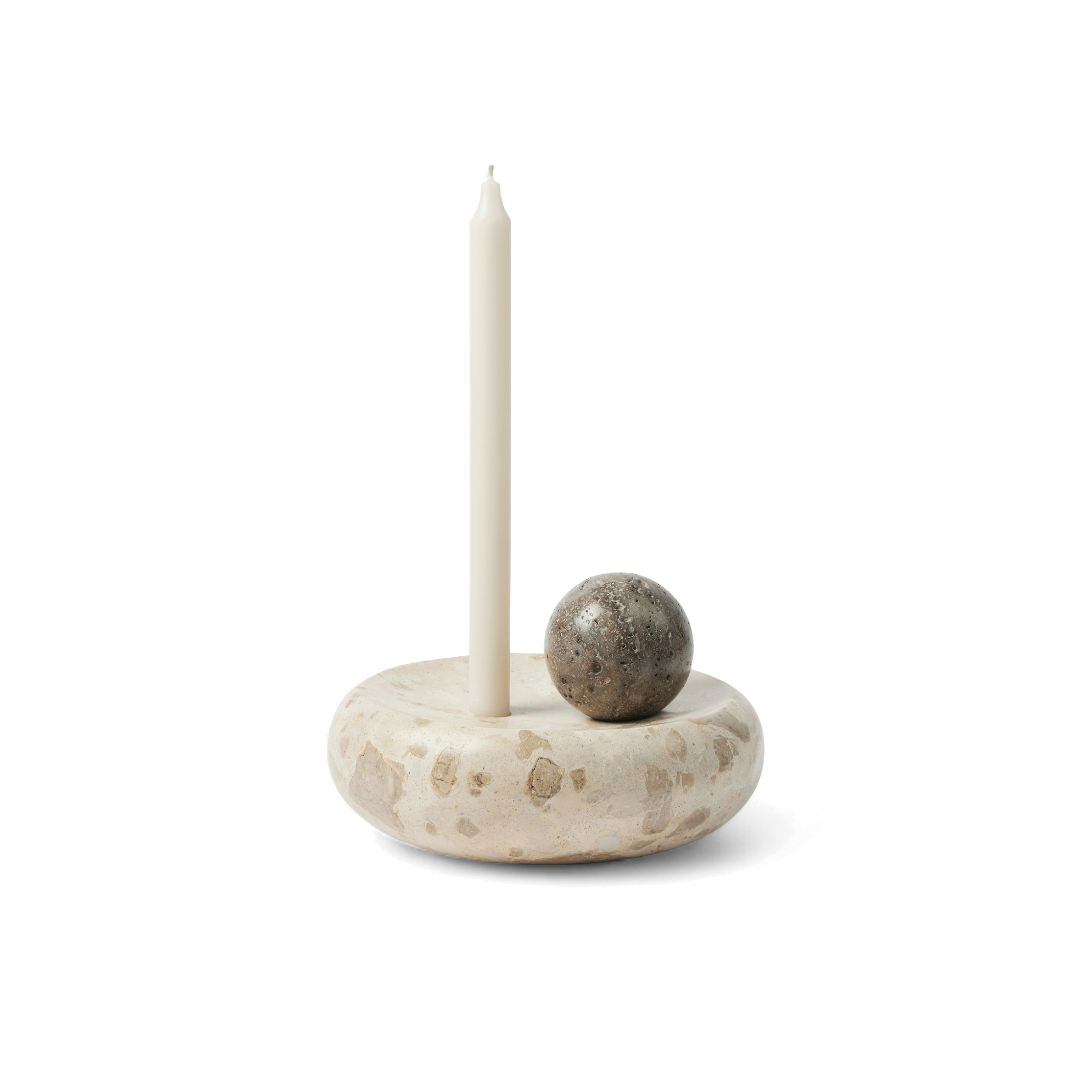 Will a single taper feel substantial on the table? Yes—Coherent seats the candle in a solid beige-marble disc, counterweighted by a dark travertine sphere that reads like a small planet.