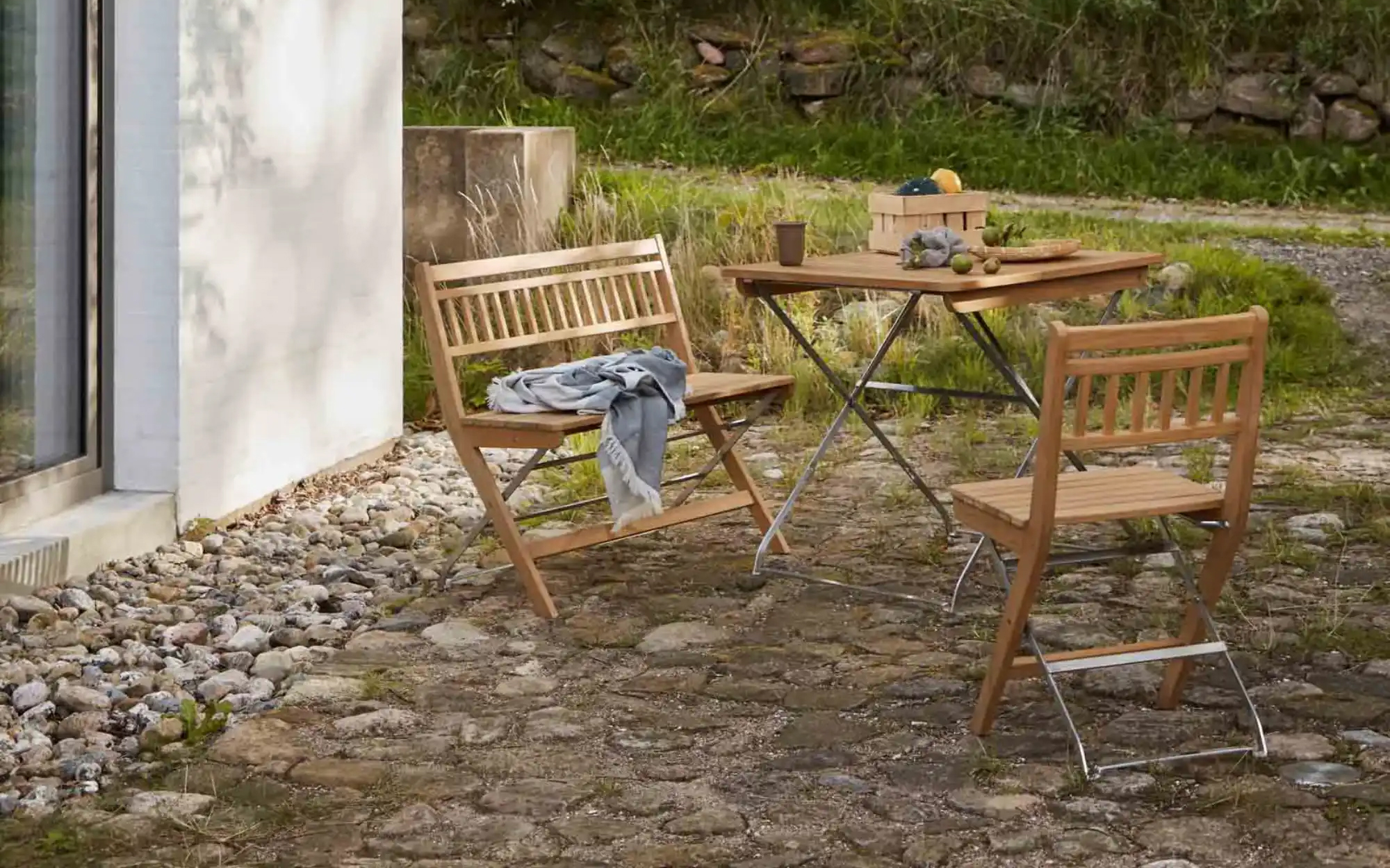 Not every outdoor space is a garden. Lilleø was designed for the in-between: balconies, patios, courtyards, and the outdoor corners of cafés that only fit a table or two. Made from solid teak and stainless steel, the chairs and table fold up when they’re not in use—easy to move, easy to store, and built to last.