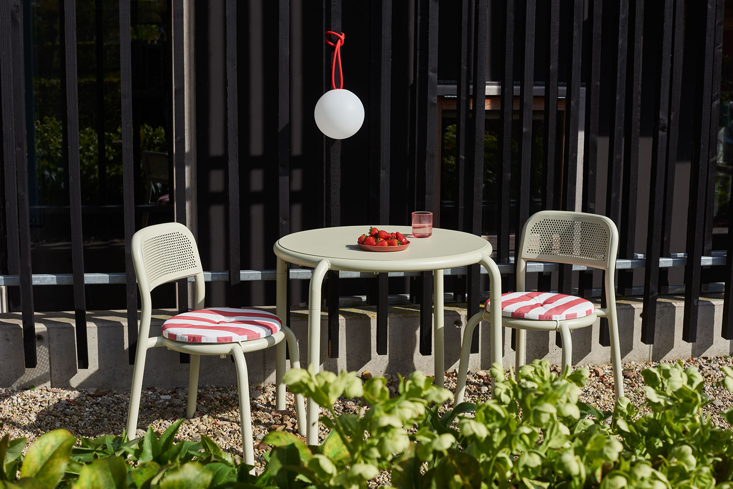 Toní is outdoor furniture that keeps things easy. Powder-coated aluminum frames stay light in the hand, steady on a breezy deck, and unfazed by rain or full sun. Perforated seats and tabletops let water drain straight through, so everything dries fast.