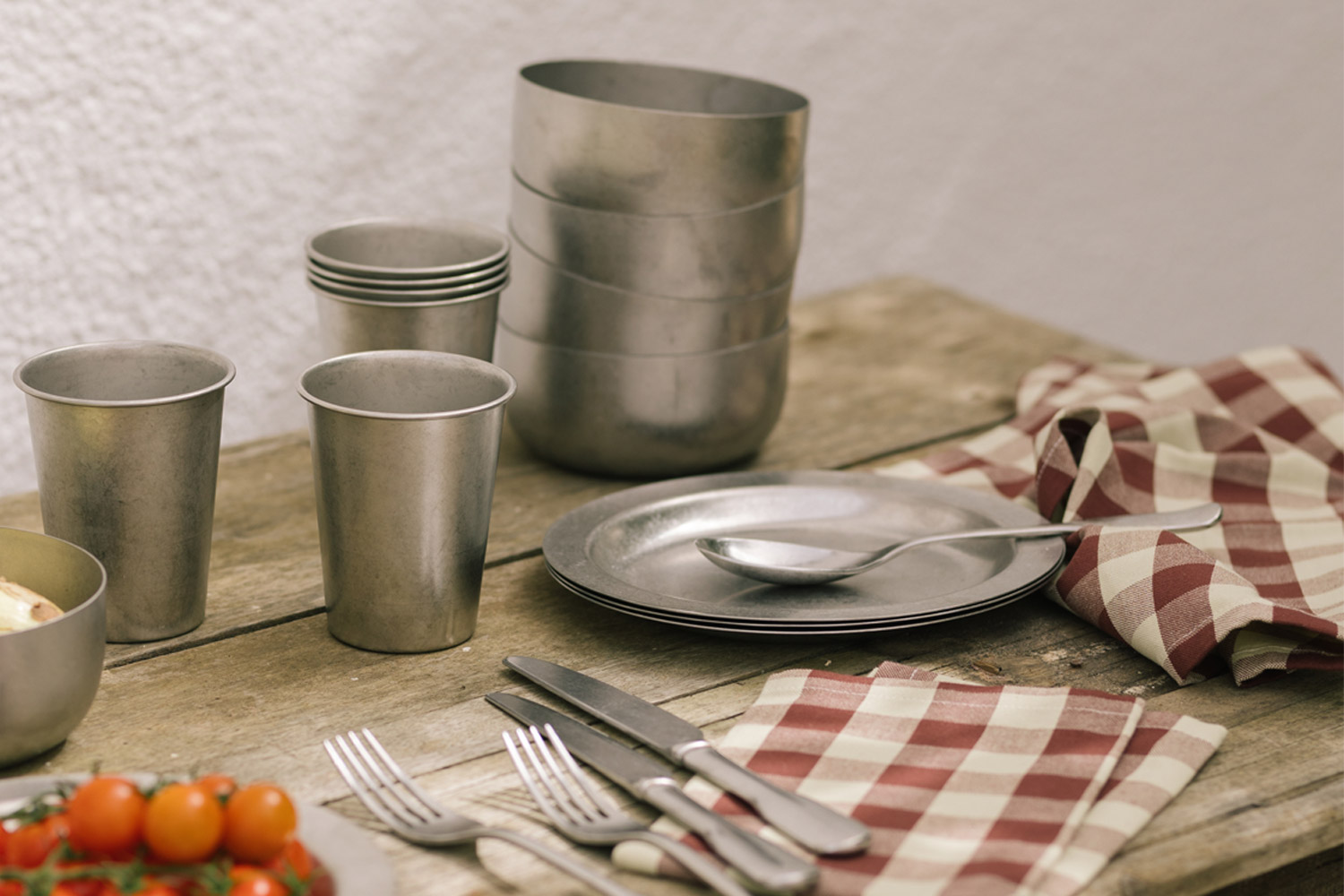 The Tumbled collection is stainless steel tableware that’s meant to be used hard and loved for a long time. The finish has a soft, tumbled texture—comfortable in the hand, forgiving with fingerprints, and sturdy enough that you stop worrying about chipping, cracking, or babying anything. These are the pieces you grab when you want the table to feel good, but you also want to live your life.