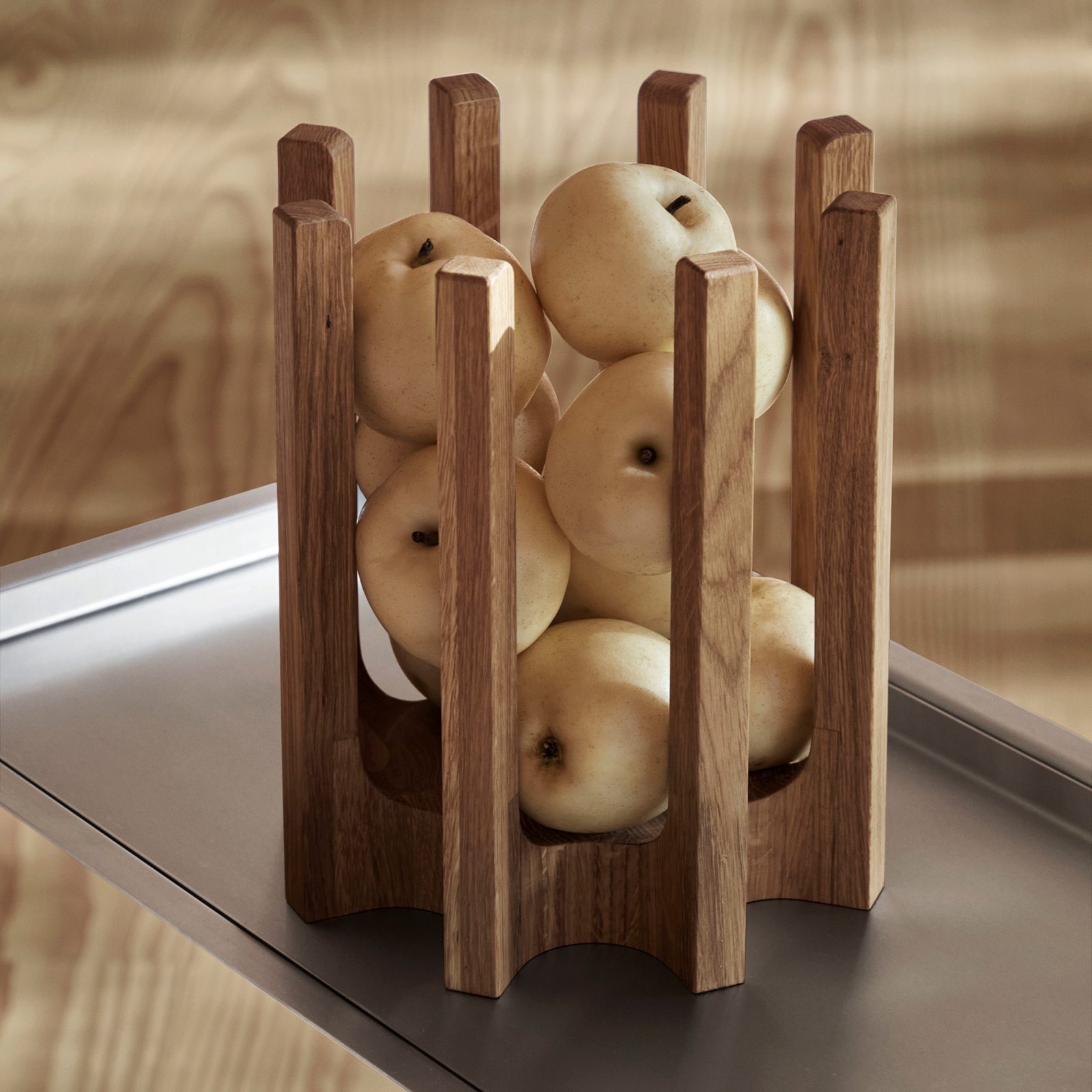 Designed by Kristina Dam Studio and crafted in Poland, the Column Bowl is made from FSC®-certified oak and finished with food-safe rapeseed oil. Inspired by Ionic columns, this fruit bowl features a repetitive column motif that plays with positive and negative space, enhancing its visual appeal on any kitchen or dining table. The design includes finely rounded corners and precise joints at the base, demonstrating skilled craftsmanship. This bowl serves as a practical kitchen accessory while also fitting seamlessly into various interior styles due to its architectural influence and commitment to sustainable materials.