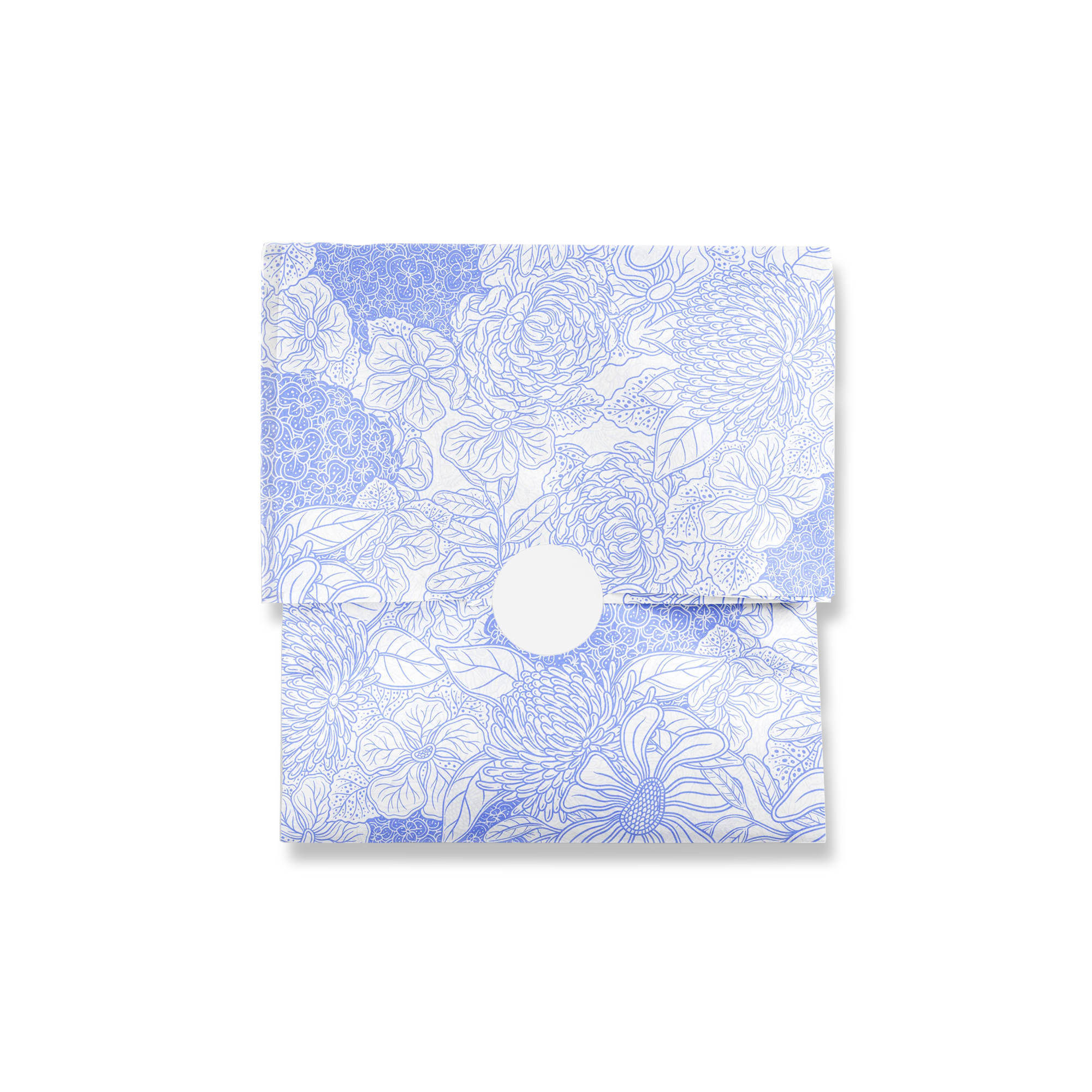 Lilac-blue linework, all garden—blooms, leaves, tiny dotted ground—drawn fine enough to stay crisp even when folded.