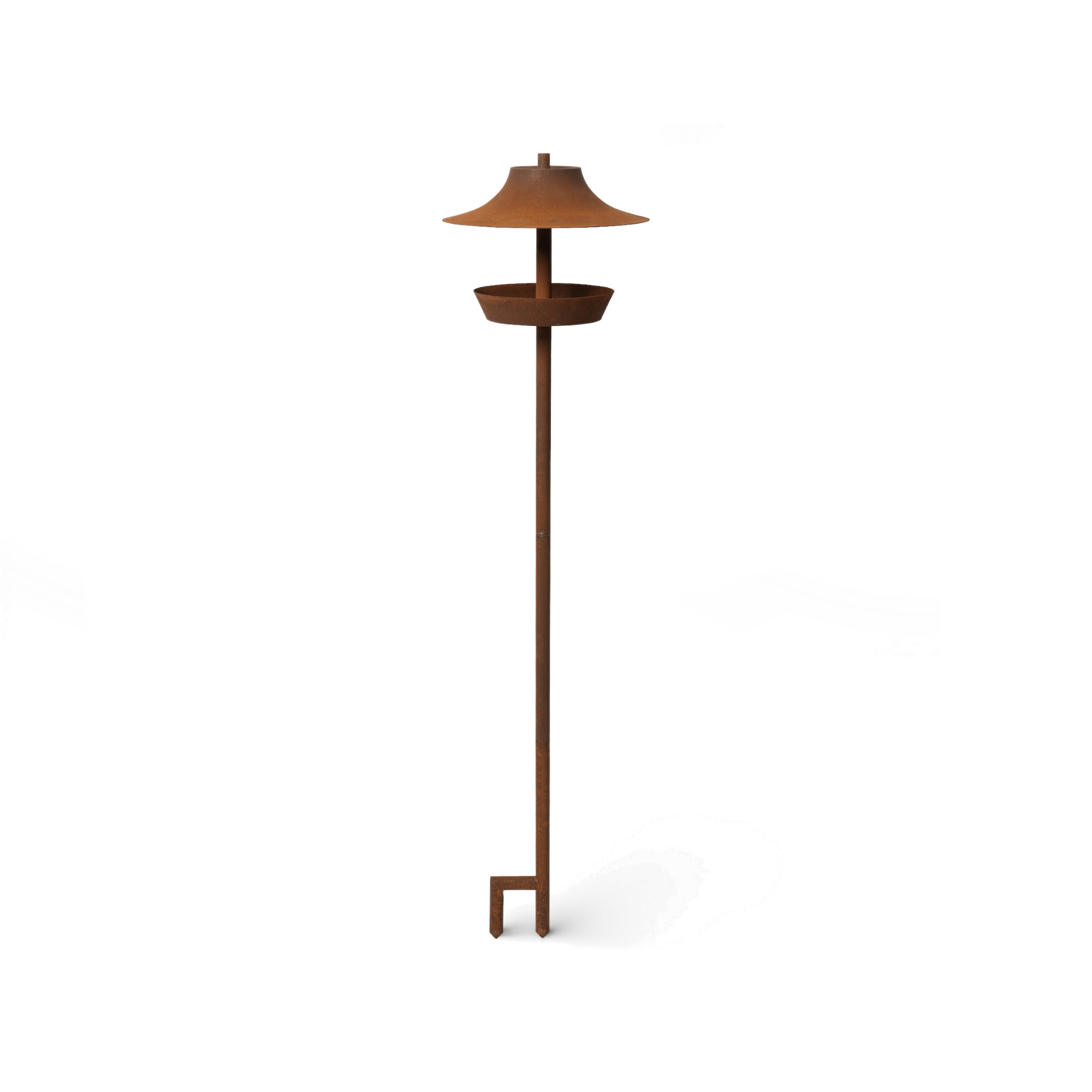 Cortivo is a corten-steel bird feeder that gives you two clean ways to place it: hang it from a branch with the included hook, or mount it on the pole and stake it directly into the ground. Same feeder, two moods—tree-hung like a little canopy in the air, or planted in a bed like a slender garden marker. It’s made from corten steel, so the rust tone is the real thing—weather brings it to life, and the surface deepens over time.