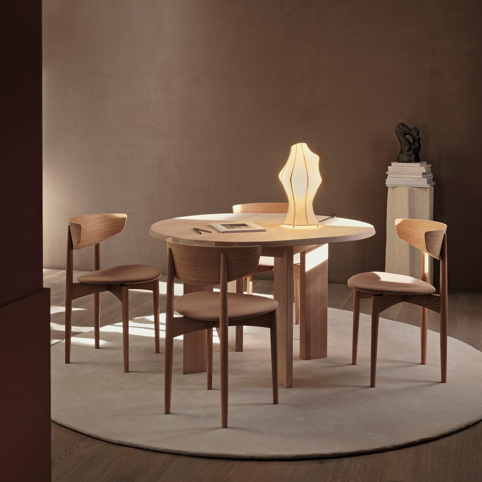 The Dae Table Lamp by Ferm Living is a smaller version of the floor lamp, designed to suit tabletops and smaller surfaces. This lamp is crafted from non-woven polymer, a material that ensures both durability and a delicate aesthetic. The lamp’s organic shape, inspired by the Pieridae Butterfly Chrysalis, features a translucent shade that diffuses light softly, creating a warm and inviting glow suitable for any setting.