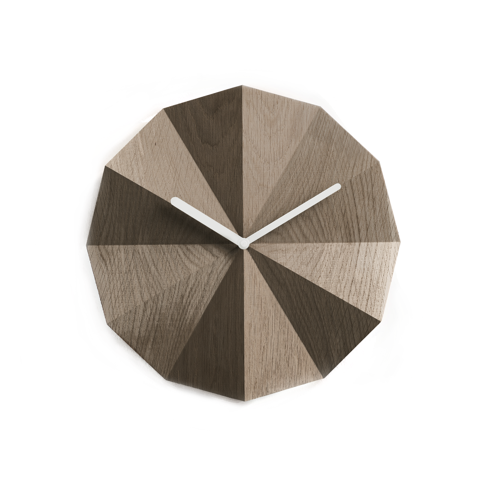 This smoked-oak version shows a warm grain beneath the dark finish, giving the shadows extra depth. The quartz movement is silent, so you’ll see time passing before you hear it. Hang it straight on the wall or rest it on the optional Delta Stand if you want it leaning on a shelf. Also available in natural oak, matte black, and matte white—same folded surface, different mood.