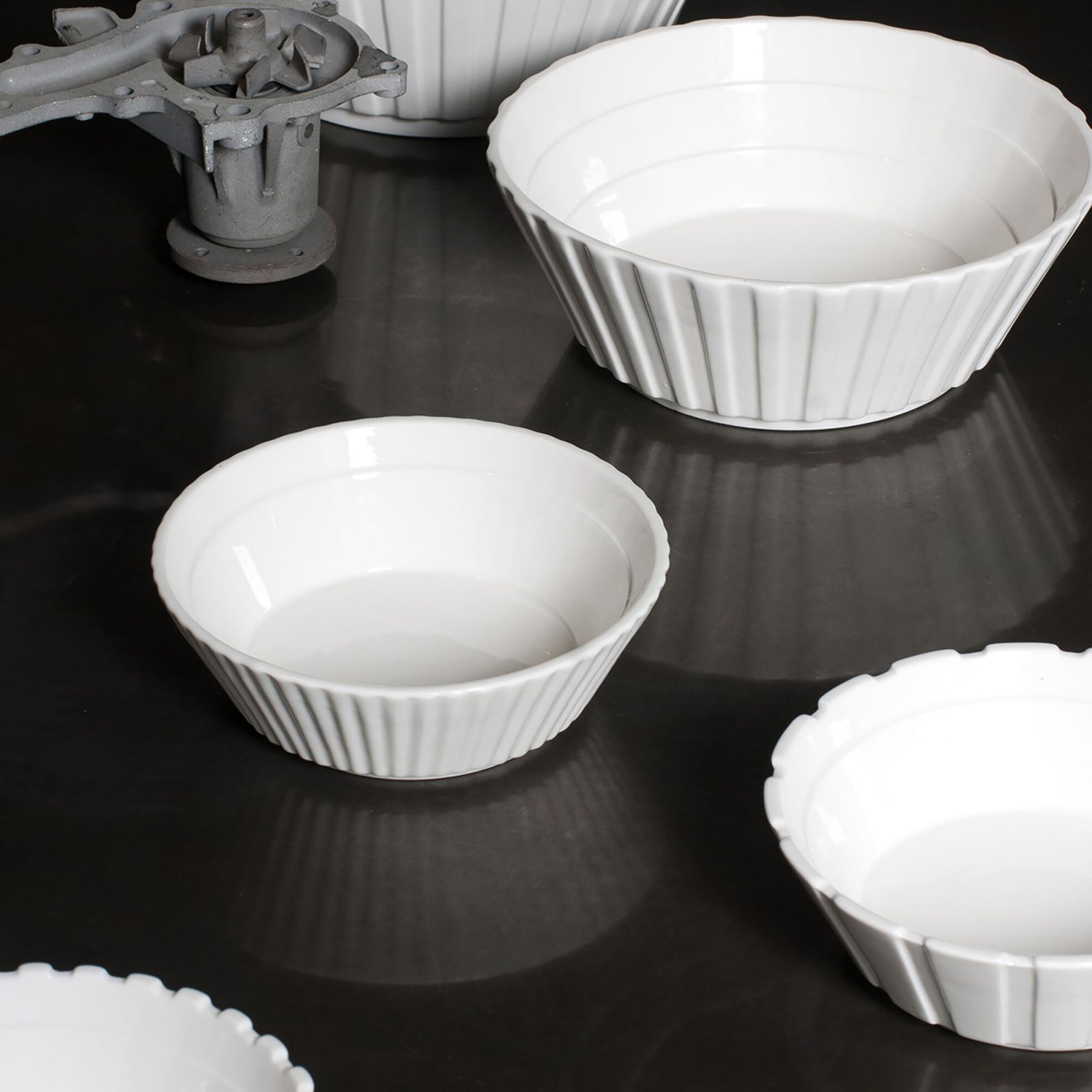 This set of three porcelain bowls is part of the Machine Collection, a unique ceramic series designed by Diesel in collaboration with Seletti. Inspired by the forms of gears, cogs, and mechanical components, the bowls feature distinctive ridged detailing for both function and style. The collection also includes jars, plates, and coffee cups, bringing an industrial-inspired aesthetic to the dining table.