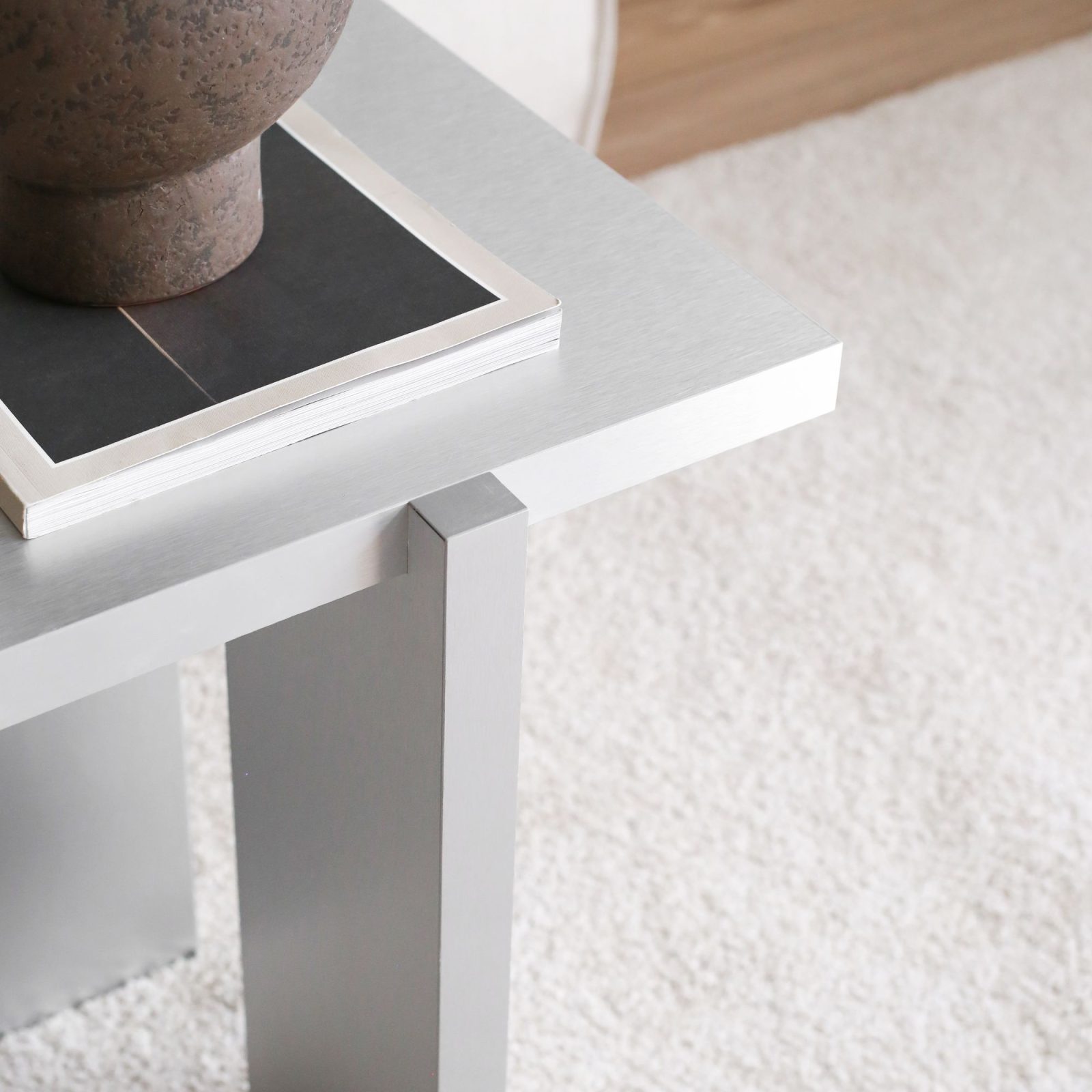Bold and elemental, the Dolmen Side Table takes its name from the ancient stone structures it quietly echoes. With its sharp angles and solid stance, it feels more like an architectural fragment than a piece of furniture. The brushed metallic laminate catches light with a soft gleam, giving the form a cool, sculptural presence. Its simplicity is its strength—three planes intersect, no ornament, no flourish. Whether placed next to a sofa, beside a bed, or used as a standalone accent piece, Dolmen lends weight and quiet clarity to a space.