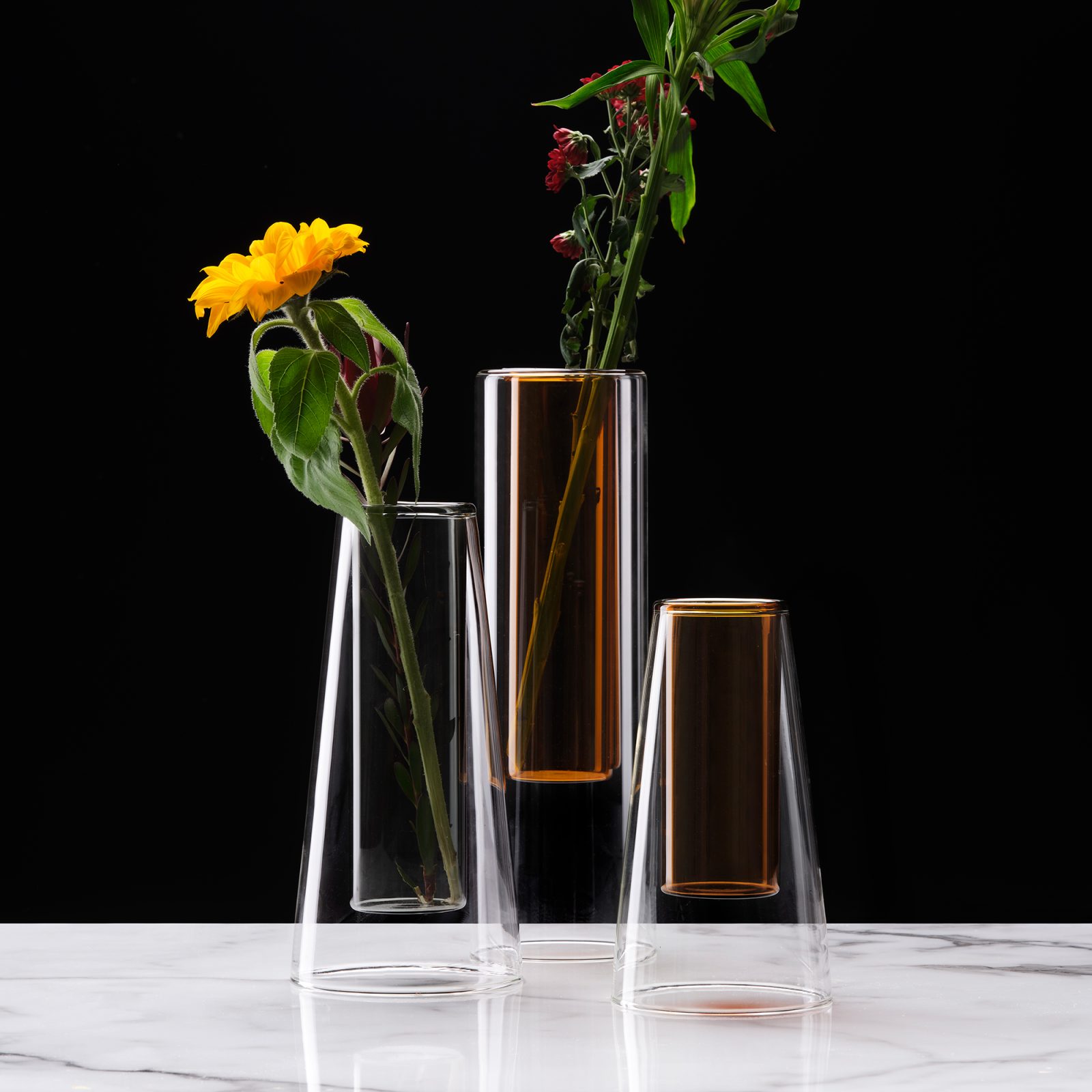 This double wall glass vase is basically two vases in one: a slim inner tube for stems, held inside a wider outer form that gives the whole piece its shape. In this gray version, the color sits quietly in the glass—more smoke than “tint”—so whatever you put inside looks a little more graphic without trying too hard.