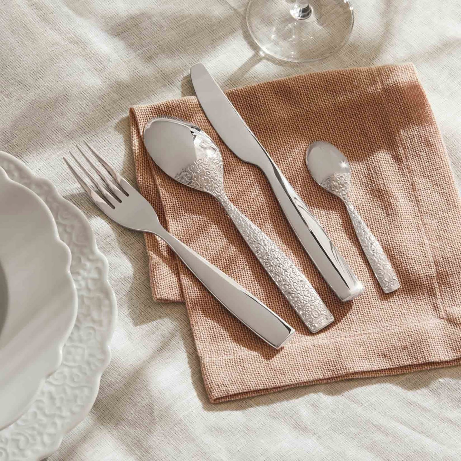 Perfect for a wide range of occasions, the Alessi Dressed Cutlery Set with 24 Pieces offers a classy way to refine a tablescape. Designer Marcel Wanders used delicate decorations to give this flatware set a refined look and a tactile feel. The detailed patterns enhance the cutlery that boasts clean lines and elegant curves, with one side featuring only a smooth finish. Crafted from top quality 18/10 stainless steel, each product is not only extremely resistant to rust, but also keeps its polish for longer. This Alessi Dressed Cutlery comes with 24 pieces, with six each of a table spoon, table knife, table fork, and coffee spoon.