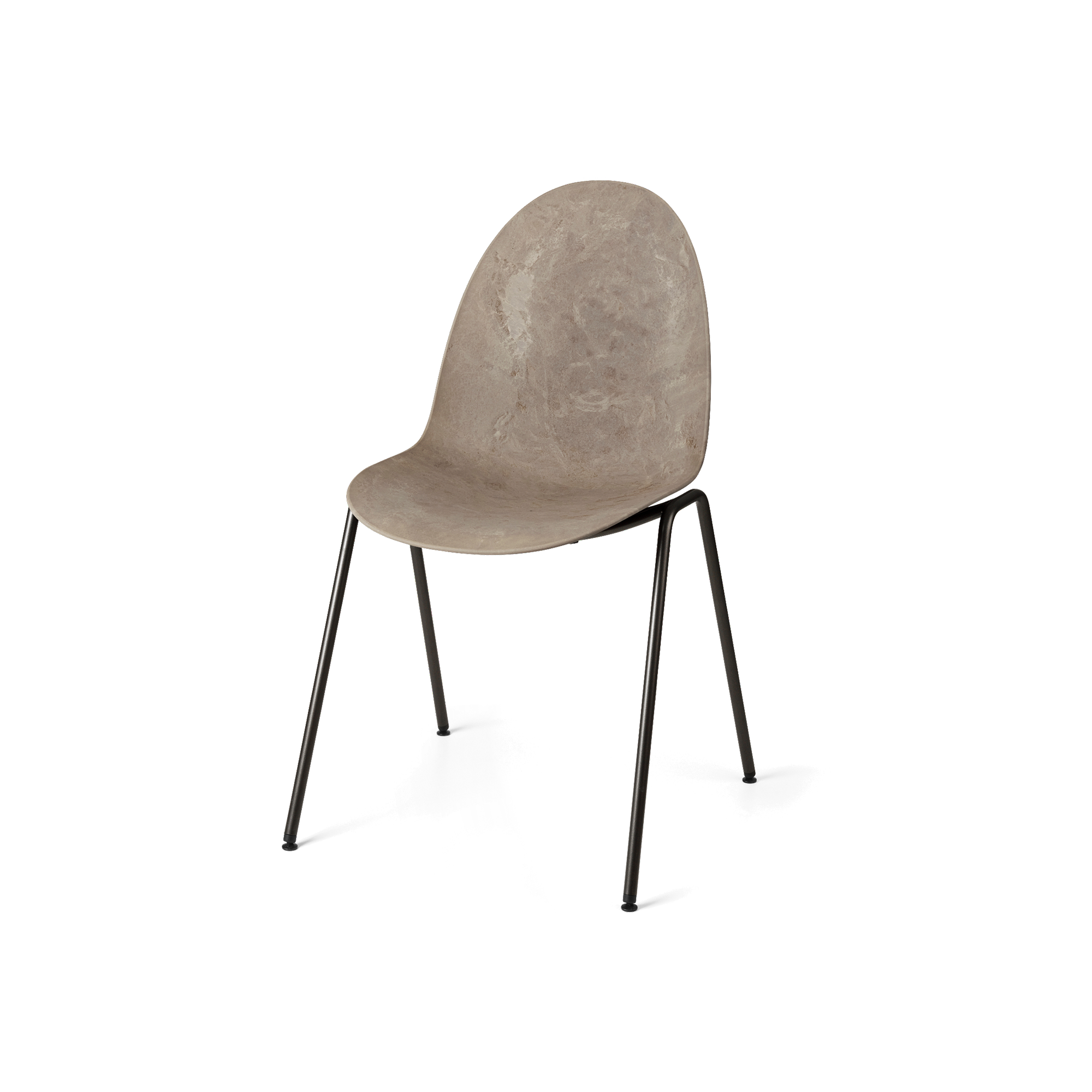 A pebble-smooth shell, lightly textured by recycled coffee husks and e-waste, rests on a lean steel frame—Mater’s Eternity Side Chair wears its back-story in plain sight. Molded from Matek®, the brand’s circular composite, the seat flexes just enough for long dinners yet keeps its shape under contract traffic. Slim powder-coated legs stack three high when floors need a sweep, and every part can be unscrewed and sorted for future reuse. Choose Coffee Waste Brown, Industrial Ash Grey, Black, or Oyster; the muted mineral tones slip next to oak tables, terrazzo counters, or workstation clusters without a fuss. Light, durable, and built for easy disassembly, Eternity proves that a responsible chair can still look sharp and sit comfortably day after day.