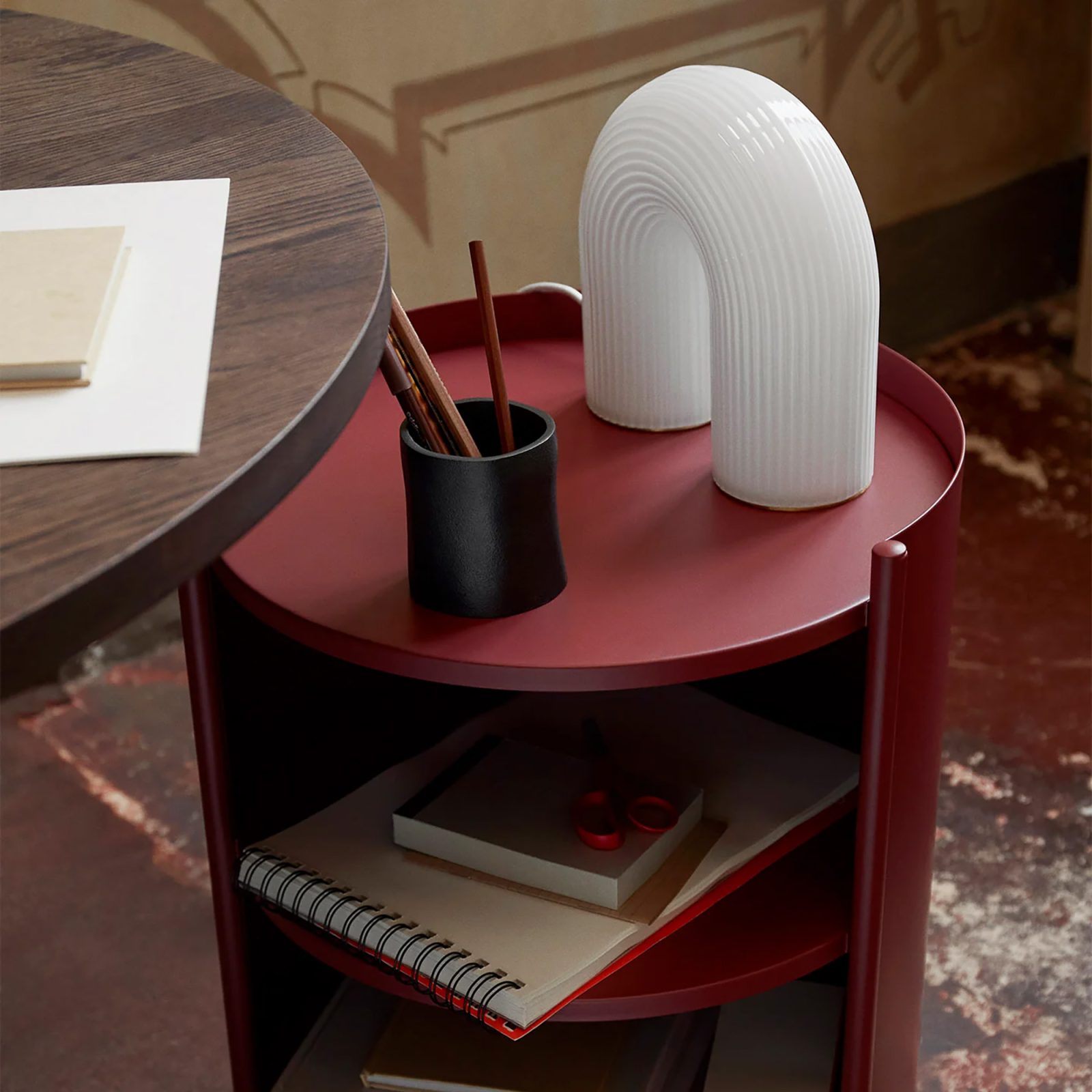 Introducing the Eve Storage, a unique and stylish black metal bedside table that combines modern design with practical functionality. This eye-catching cylinder-shaped black metal bedside table is crafted from durable, powder-coated steel and features three spacious shelves, two of which are partially concealed behind its sleek frame.