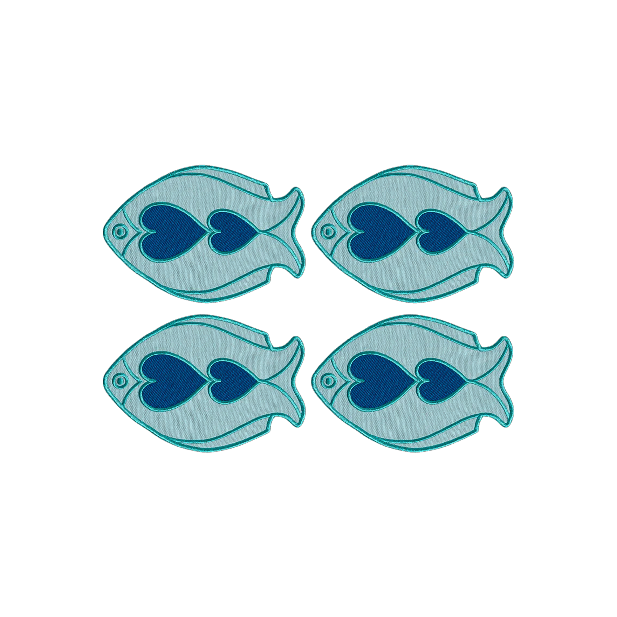 A set of four fish-shaped coasters in linen-cotton fabric with embroidered detailing and appliqué. A playful, graphic accent for cocktails, aperitivo, and everyday table settings.