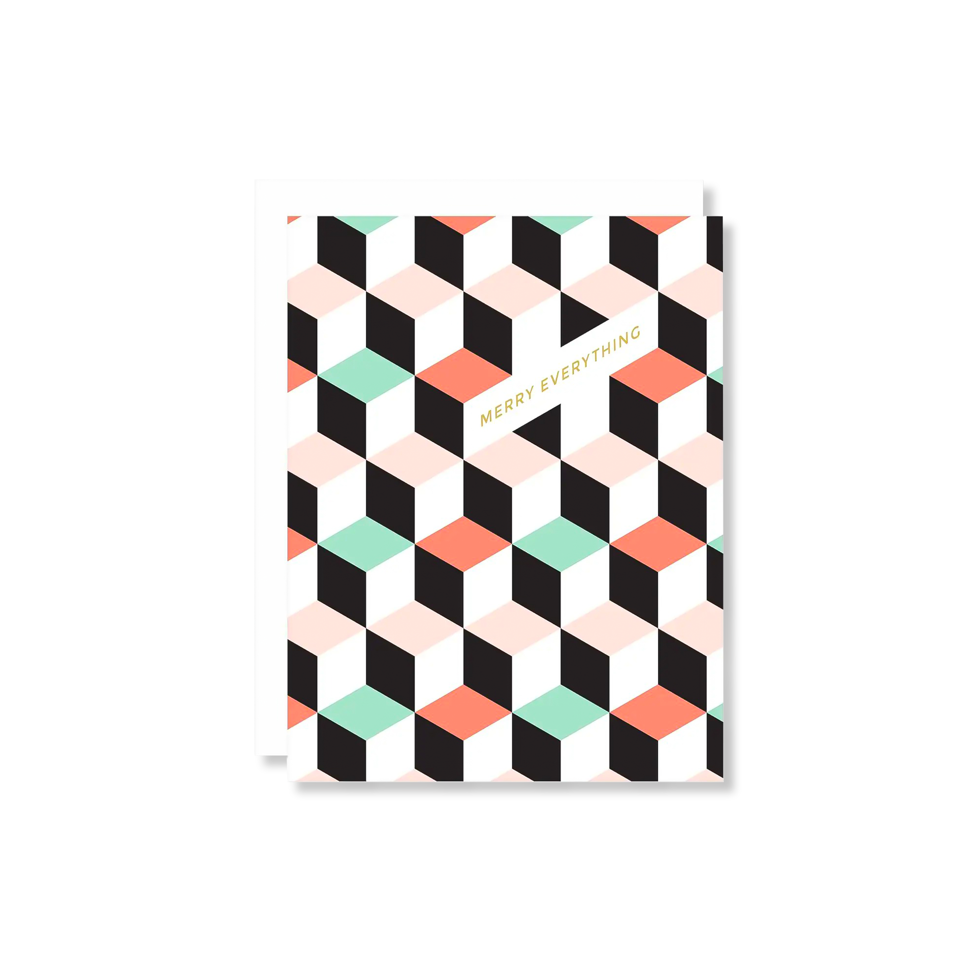 Bright blocks, tilted into a pattern that feels festive without the usual holiday clichés. The Geo Merry Everything Card brings a modern graphic spin to seasonal greetings. A geometric grid of cubes in coral, mint, blush, and black frames the gold-foil message, “Merry Everything.”