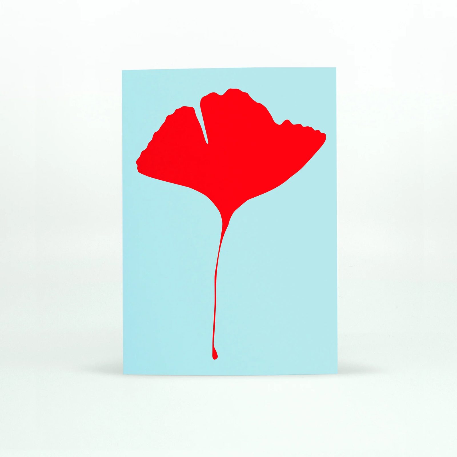 The striking red outline of the unique Ginkgo leaf is set dramatically against a backdrop of sky blue, creating a vibrant contrast that captivates the eye. Mark any significant event or everyday moment with this greeting card from the top-selling Ginkgo Pop collection. Since the inside of the card is left blank, it can be tailored with a personalized, handwritten note.