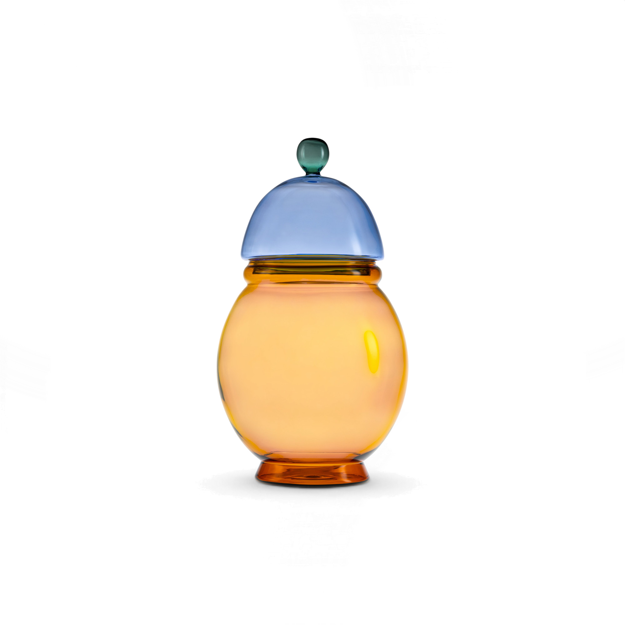 Gli Scacchi is IVV’s little collection of borosilicate glass vessels that sit somewhere between container, object, and small table accent. The Amber version is the warm, honey-toned one—topped with a cool blue dome and a tiny green knob that makes opening it feel oddly satisfying.