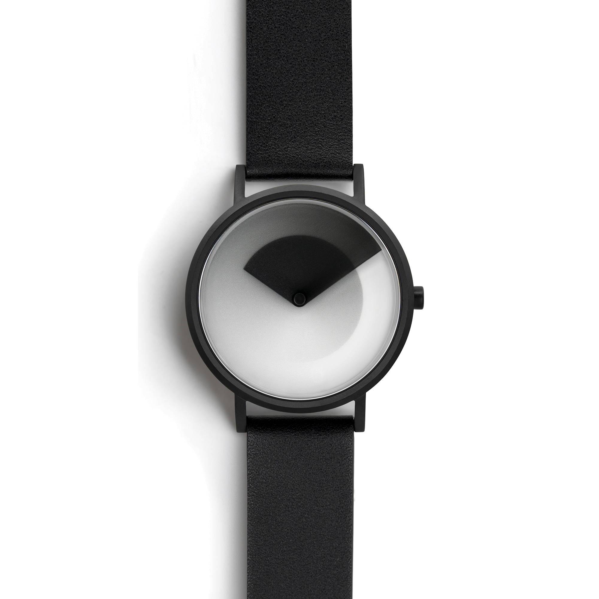 The dial starts out almost full—charcoal fading to near-ink—and then, minute by minute, a paler wedge slides across, carving new shapes out of the darkness. That’s the Black Gradient Watch in motion. Two stacked, semi-transparent disks mark hours and minutes, so time reveals itself as overlapping tones rather than ticking hands.