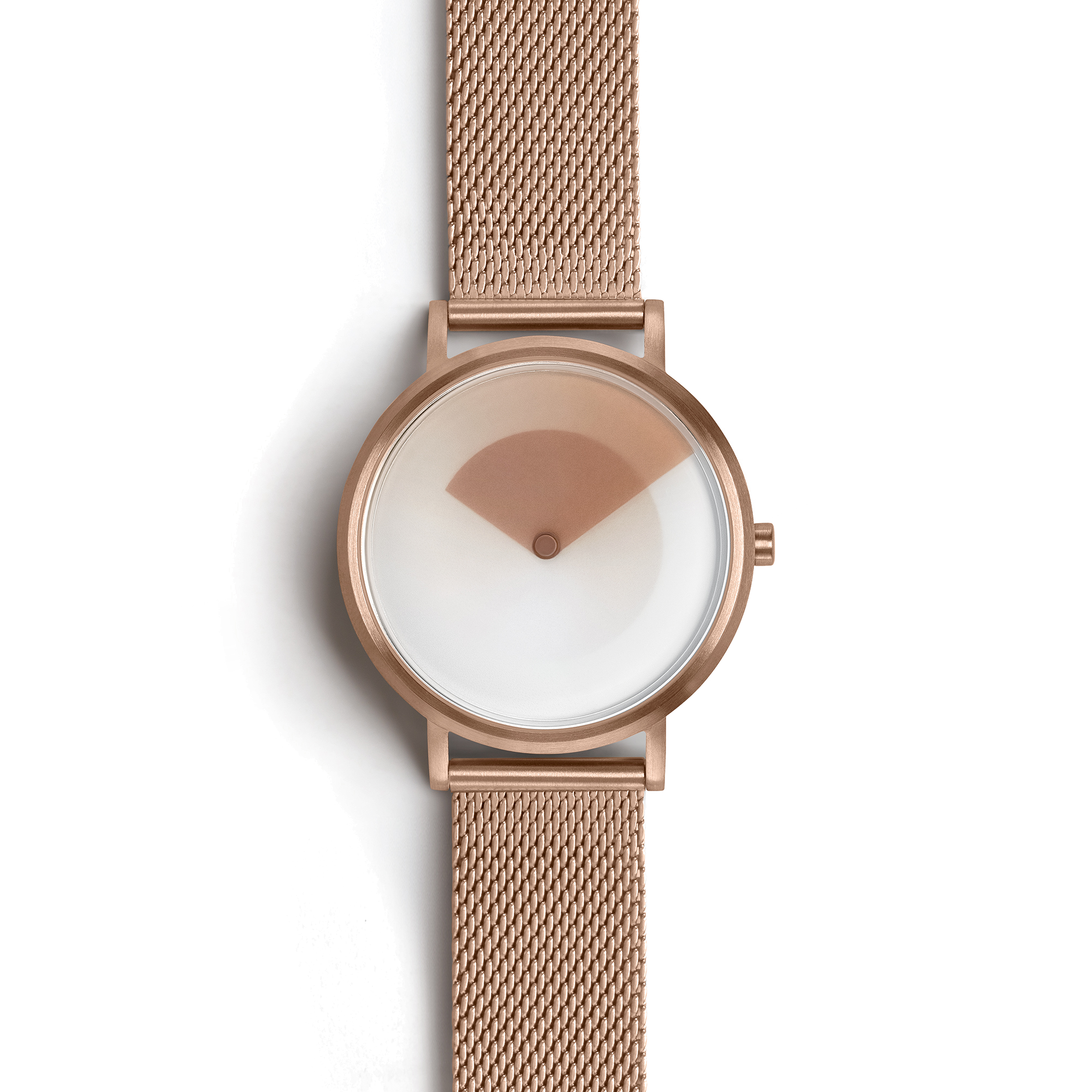 The first thing you see is the color — a warm rose tone that sits somewhere between copper and blush. The next thing you see is that the dial won’t stay still. Two translucent disks keep sliding over one another, so every few minutes the little pie-slice of shadow shifts again. No hands, no tick. Just motion.
