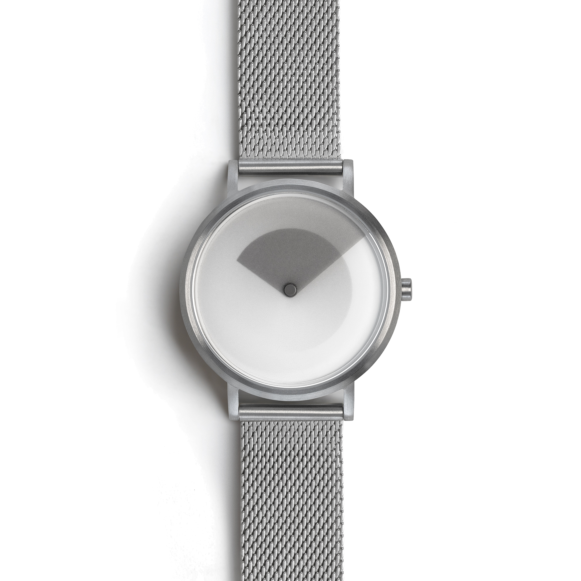 A pale arc drifts across a silver dial—dark at twelve, almost white by three-o’clock—then keeps on sliding until the pattern begins again. That slow overlap is the whole idea behind the Silver Gradient Watch: two translucent disks, one for hours and one for minutes, turning time into shifting tone instead of ticking hands.