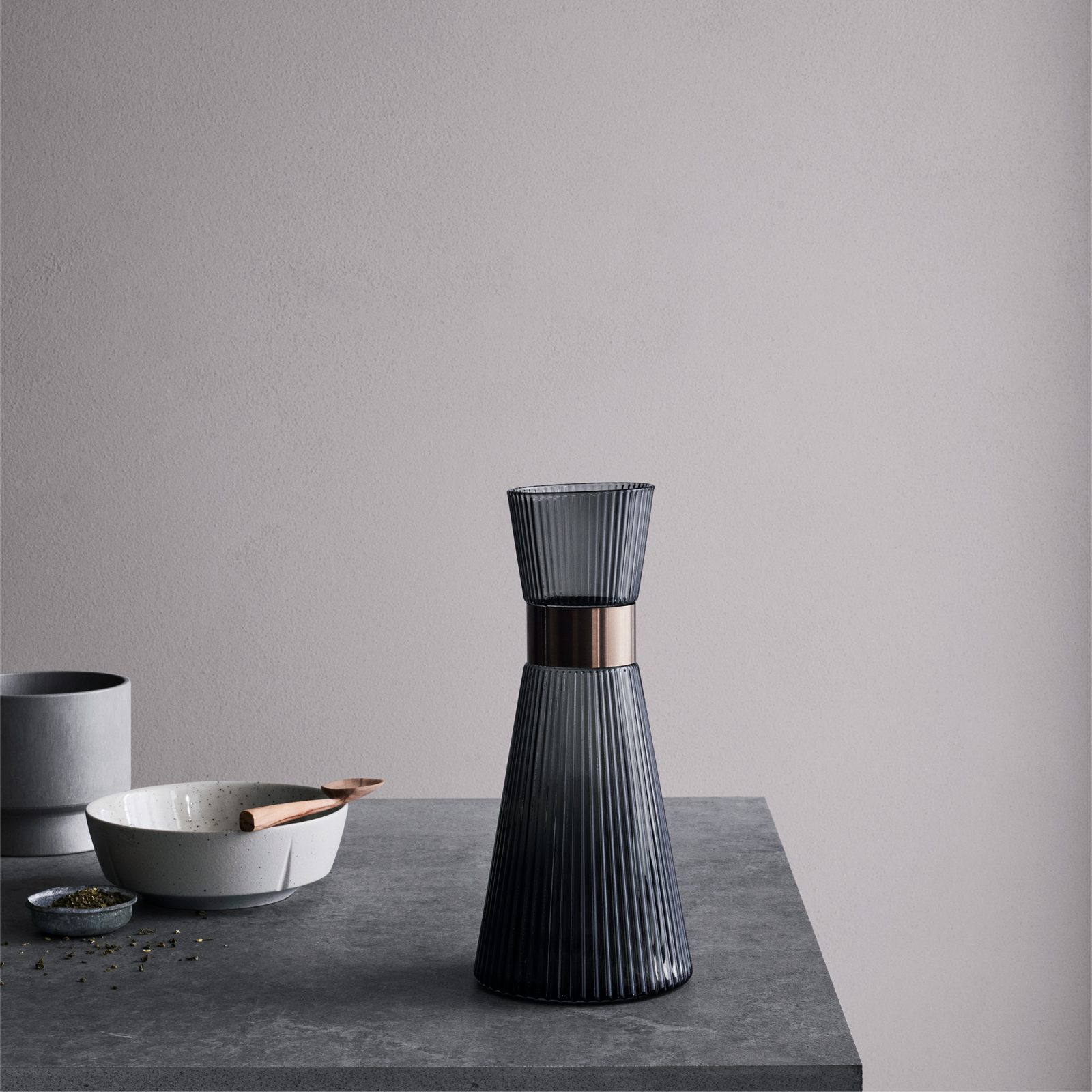 The Rosendahl Grand Cru Nouveau Water Carafe in smoky gray reimagines a classic design with modern sophistication. Crafted from mouth-blown glass, this 33.8 oz carafe features the collection’s signature vertical grooves, creating a captivating optical effect that enhances its minimalist silhouette. The smoky gray finish, combined with the sleek brass detail around the neck, lends a refined yet understated charm to its design. Perfectly sized for water, wine, or other beverages, this carafe is both functional and visually striking, making it a centerpiece for any table setting. Its tapered form ensures ease of handling, while the durable glass construction provides long-lasting appeal. The Grand Cru Nouveau Water Carafe balances practicality with timeless design, ideal for both everyday use and entertaining.