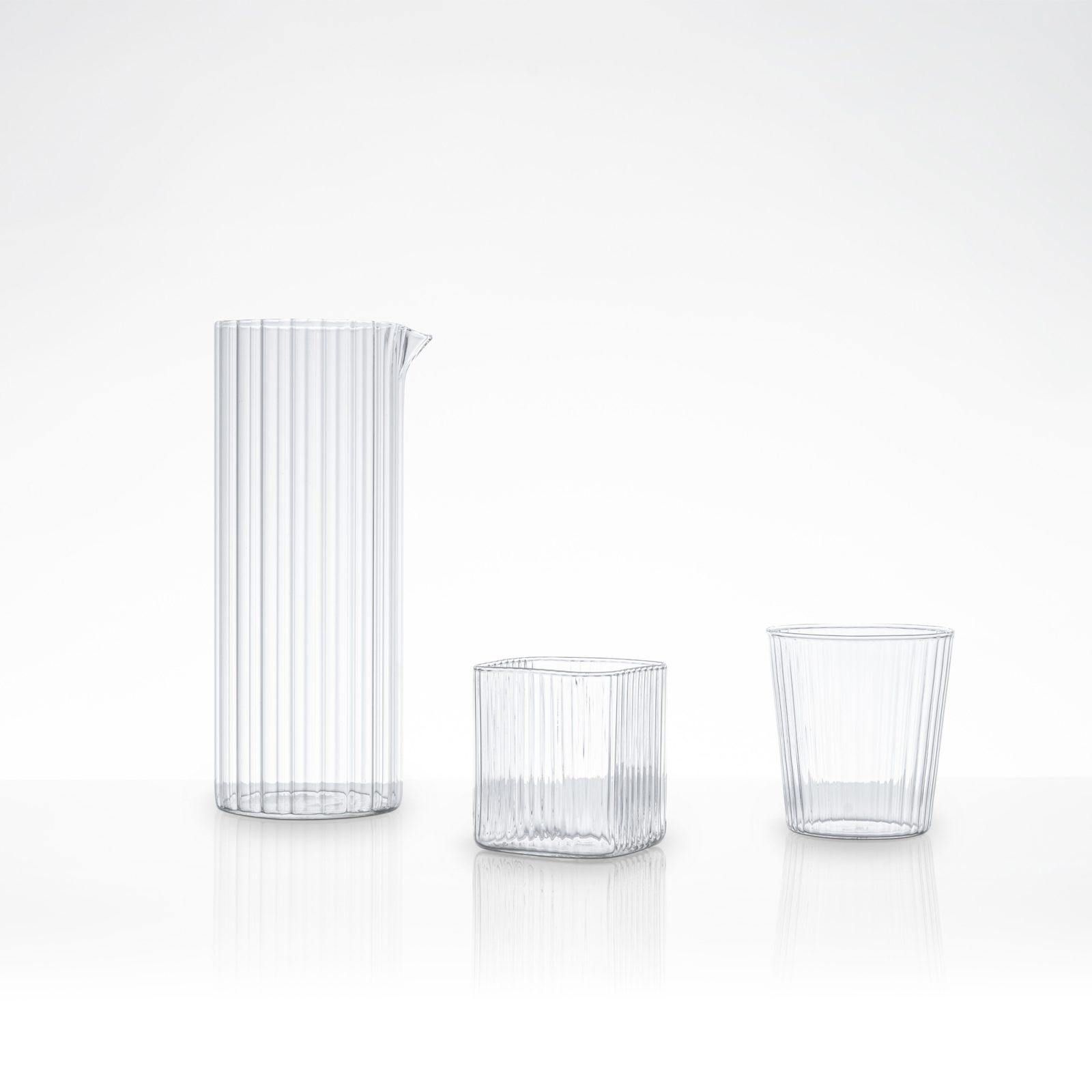 Set of 6 Italian glass tumblers with a rounded-square profile and vertical grooves. Designed by Lara Caffi. From the Groove collection, Caffi gives everyday glassware a quiet rhythm—the fluting catches light, adds a sure grip when chilled, and frames whatever you pour.
