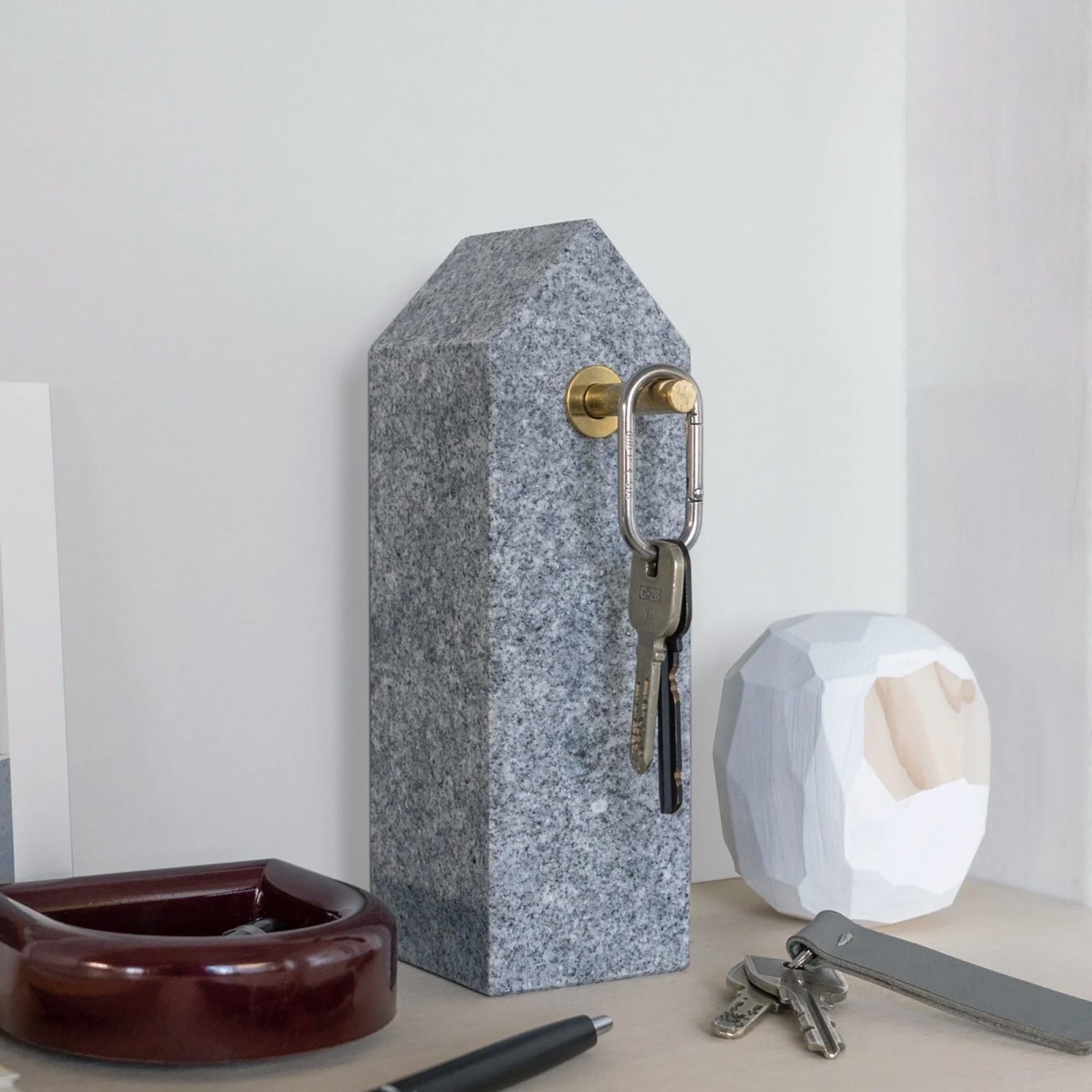 The Aji Project key holder is a practical accessory designed to keep your keys, watch, and small accessories organized. Inspired by Amsterdam’s traditional canal houses, this piece brings a touch of architectural elegance to any space. Crafted from granite sourced from ancient quarries on the island of Shikoku, Japan, it features a polished, speckled surface that is pleasant to the touch. A durable brass rod extends upwards, providing a stable and accessible spot for hanging items. The solid base ensures the holder remains upright and secure, offering a reliable “home” for your valuables.